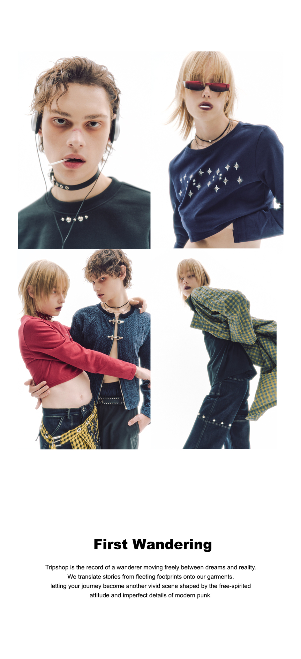 트립샵(TRIPSHOP)은 꿈과 현실 사이를 자유롭게 방랑하는 여행자의 기록입니다. 지나간 발자국 속 이야기를 옷 위에 담아, 모던 펑크의 자유로운 태도와 불완전한 디테일 속에서 당신의 여정을 또 하나의 장면으로 만들어가는 브랜드입니다.