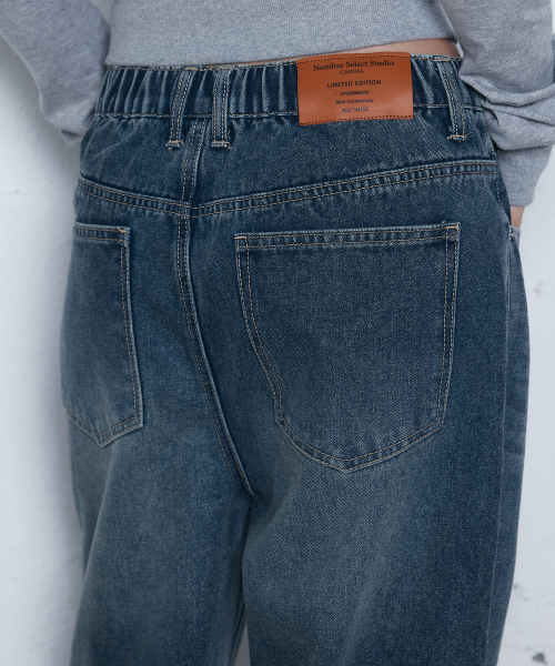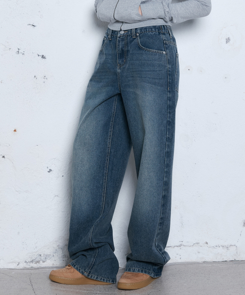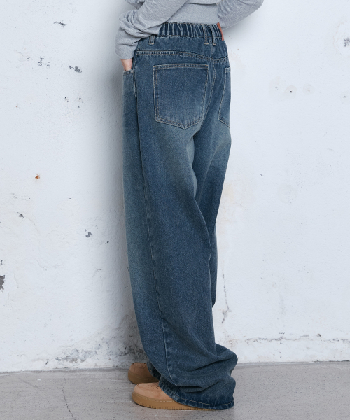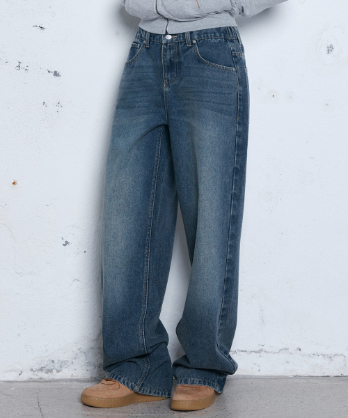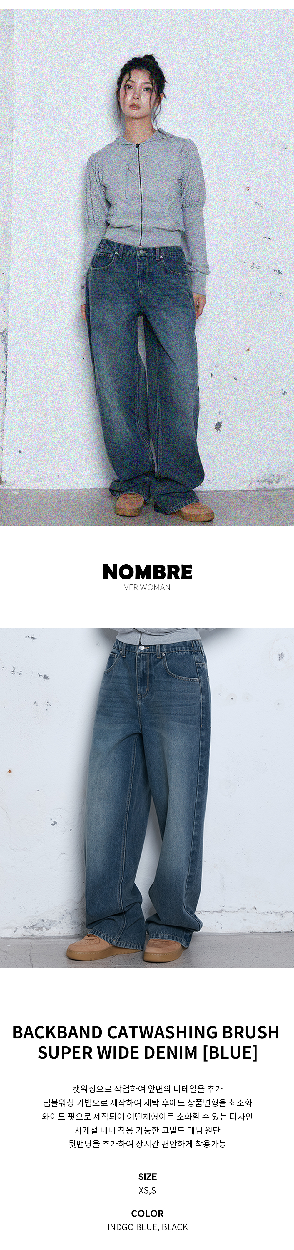 [우먼] 뒷밴딩 캣워싱 브러쉬 무지 와이드 데님 [인디고블루]