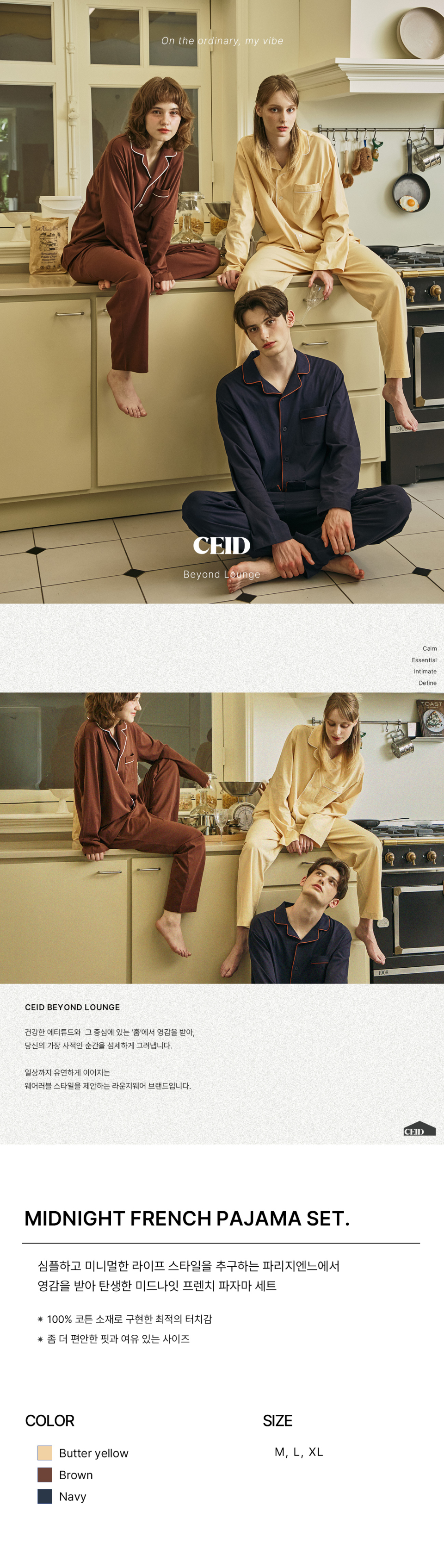 세이드(CEID)는 건강한 에티튜드와 그 중심에 있는 'HOME'에서 영감을 받아, 당신의 가장 사적인 순간을 섬세하게 그려내며, 일상까지 유연하게 이어지는 웨어러블 스타일을 제안하는 라운지웨어 브랜드입니다.