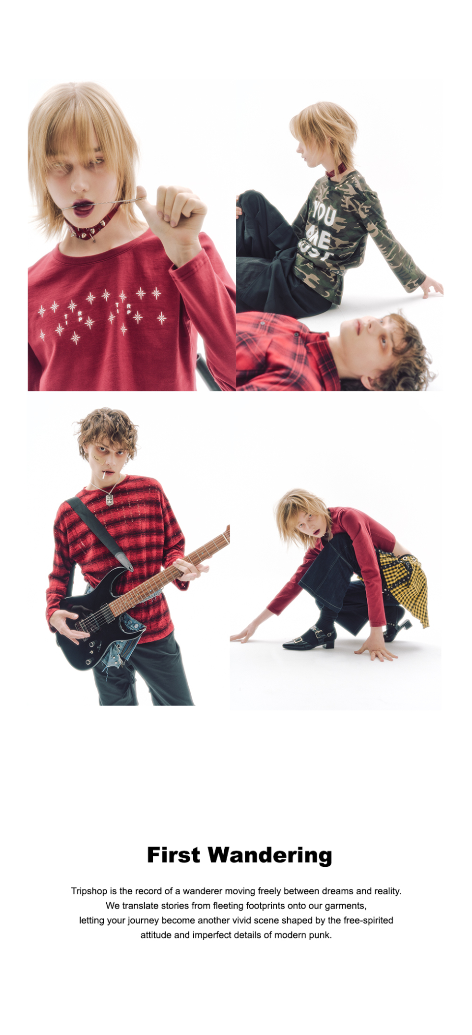 트립샵(TRIPSHOP)은 꿈과 현실 사이를 자유롭게 방랑하는 여행자의 기록입니다. 지나간 발자국 속 이야기를 옷 위에 담아, 모던 펑크의 자유로운 태도와 불완전한 디테일 속에서 당신의 여정을 또 하나의 장면으로 만들어가는 브랜드입니다.