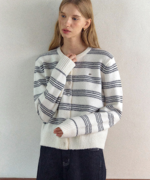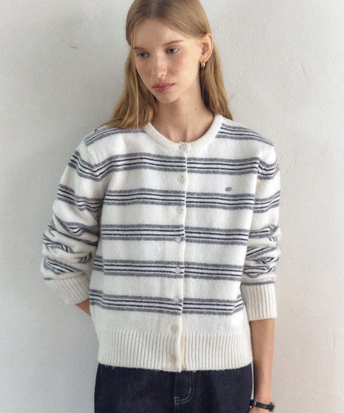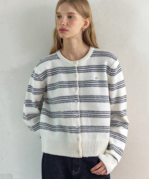 멀티 스트라이프 라운드넥 가디건 - 아이보리