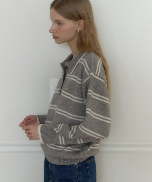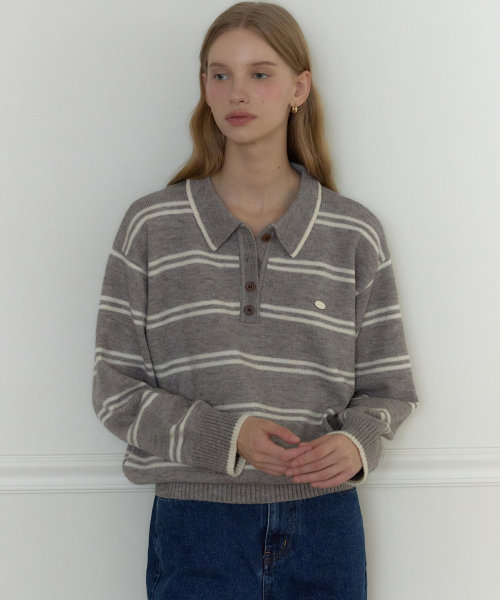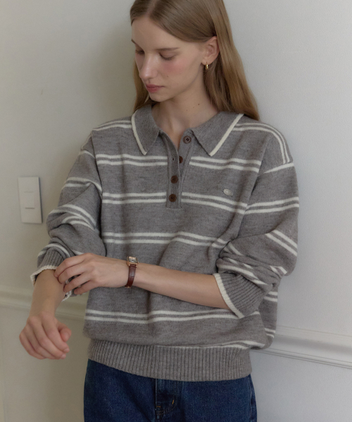 캐롤린 스트라이프 카라 니트 - 멜란지 그레이