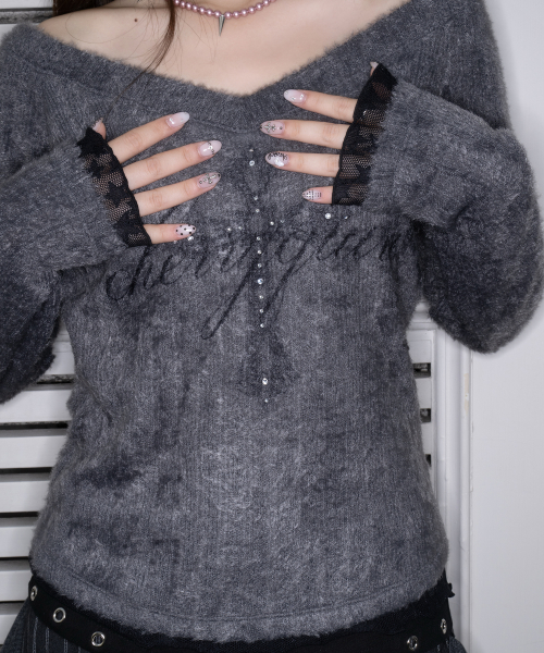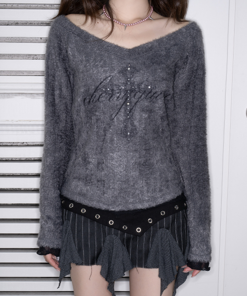 - 빈티지한 십자가 그래픽을 사용한 브이넥 니트