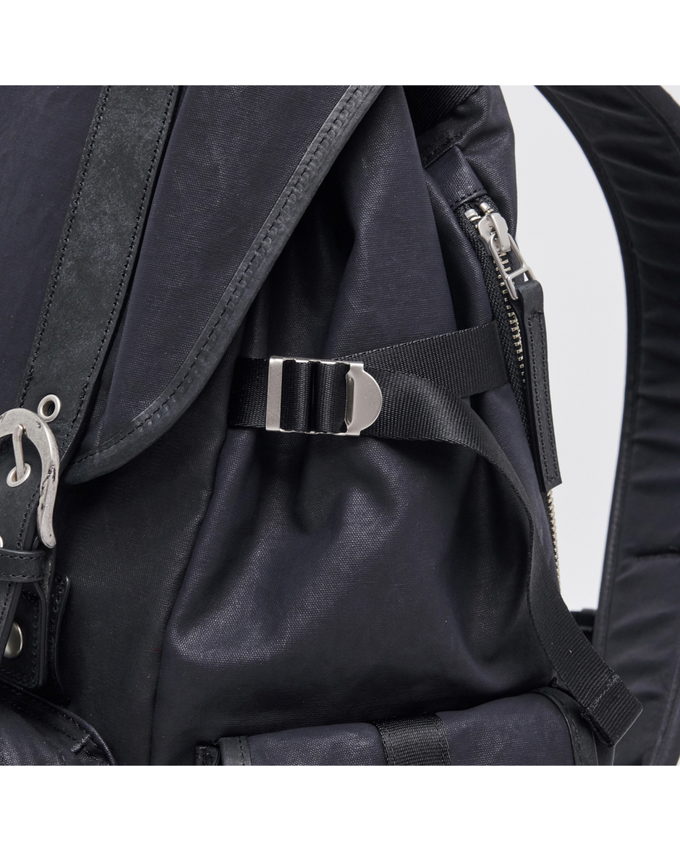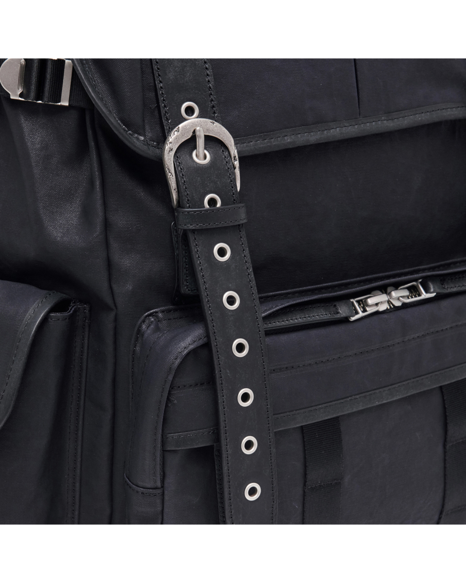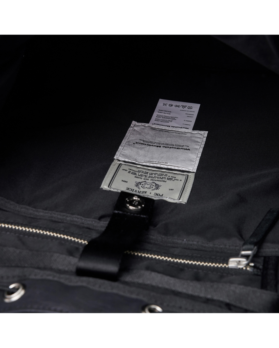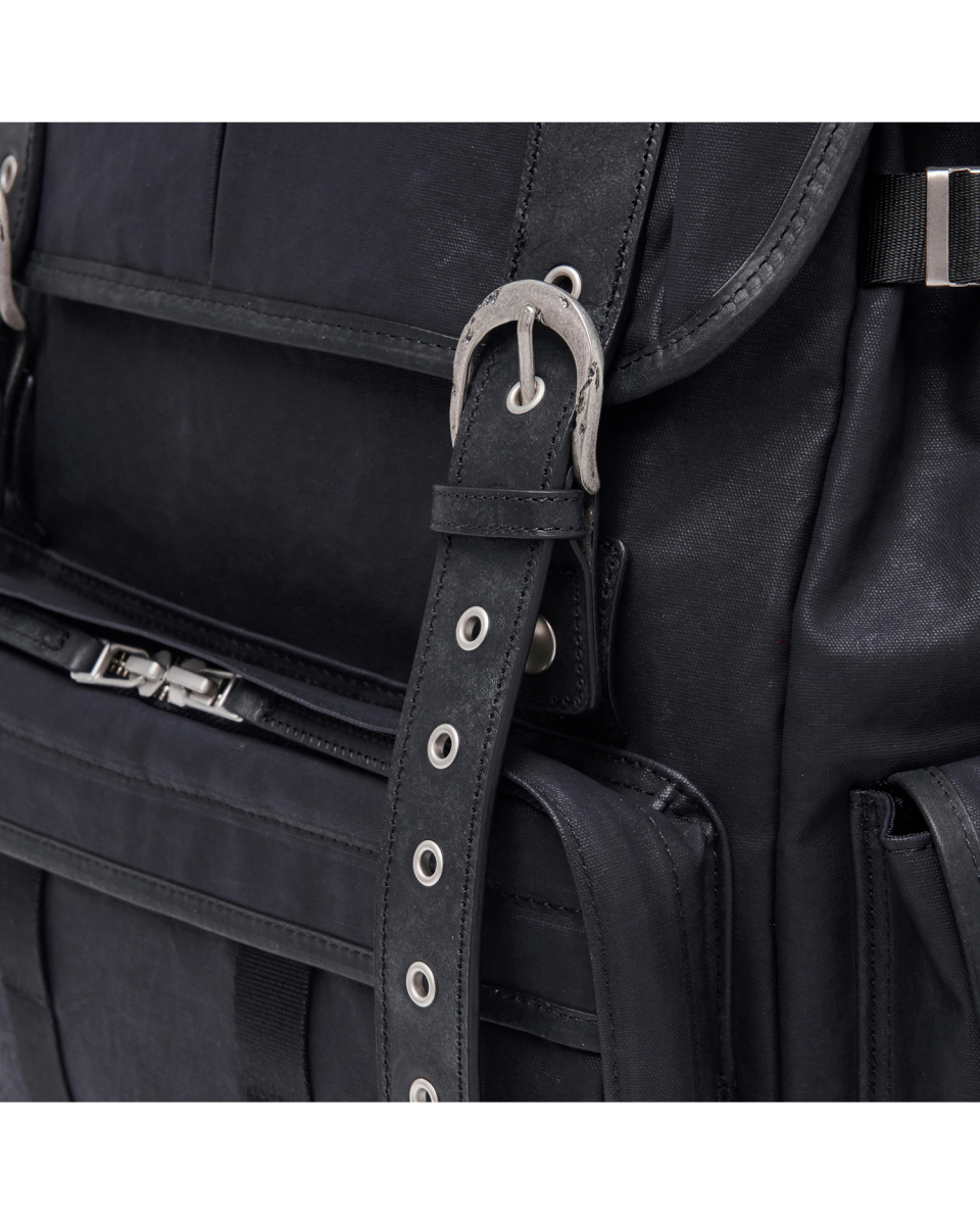버클드 럭색은 Worthwhile Movement의 밀트레인 럭색을 기반으로, POG Service와의 협업을 통해 재탄생한 빈티지 무드의 럭색입니다. POG Service가 직접 제작한 데미지 가공된 빈티지 버클 파츠가 적용되어 시각적으로 큰 특징이 되며, 오래된 장비의 거친 감도와 데미지드 질감을 현대적으로 해석해 담아냈습니다. 주 소재는 10수 캔버스 코튼과 이탈리아산 베지터블 태닝 카우하이드입니다. 10수의 캔버스 코튼은 탄탄하면서도 바이오 워싱과 폼 카본 워싱 공정을 거쳐 유연하고 부드러운 촉감을 지녔고, 옅은 광택감이 매력적입니다. 고온 카본 워싱은 은은한 톤 변화와 입체감을, 바이오 워싱은 천연 효소 처리로 부드러운 표면을 완성합니다. 또한 가죽은 시간이 지날수록 짙은 색감과 깊은 윤기를 더하며 에이징의 매력을 드러냅니다. 특히 가죽에는 구슬 스크래치(Bead Scratch) 가공을 더해, 마치 오랜 시간 손끝에 닳은 듯한 리얼 빈티지 질감을 표현했습니다. PU 코팅과 발수 코팅으로 생활 발수가 가능하며, 내구성과 형태 안정성을 위해 적절한 보강재를 삽입했습니다. 사용된 하드웨어는 POG 서비스 자체 버클과 YKK Fastener & Snap으로 구성되어, 완성도를 높였습니다.