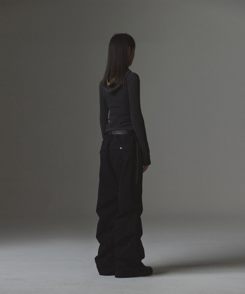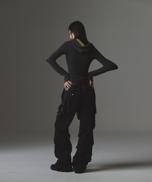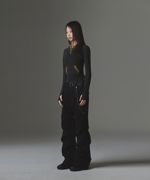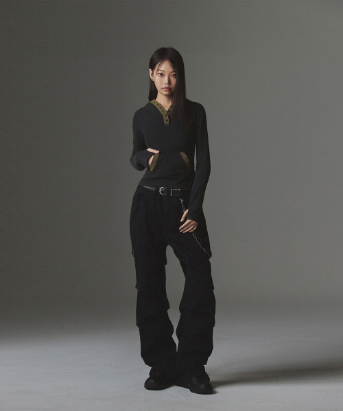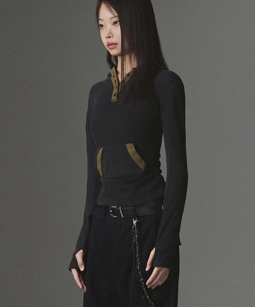 W Stud Incision Henley Neck Hood - Black