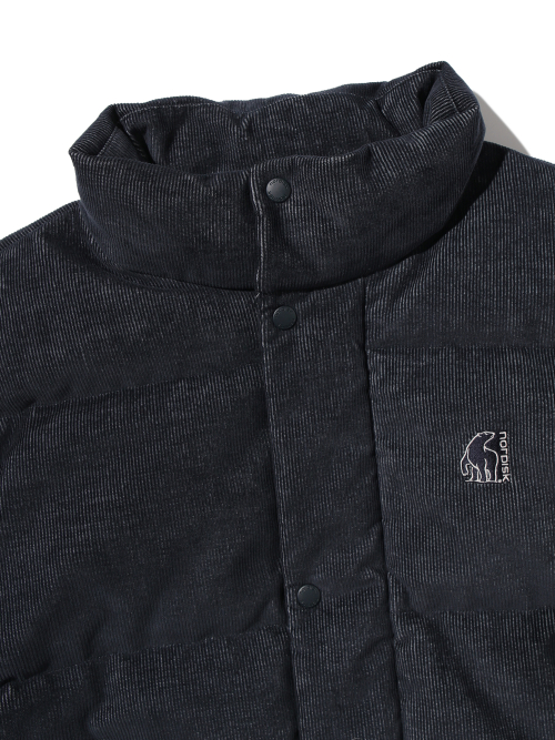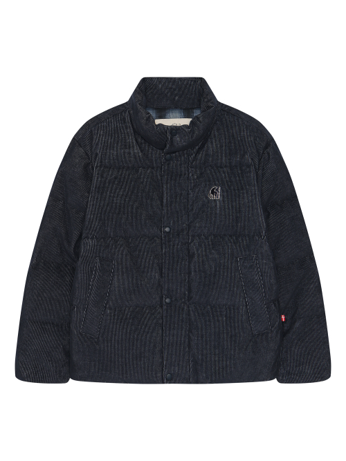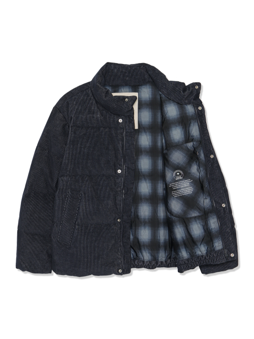 [부드러운 코듀로이 소재를 사용한 크리스탈 다운 푸퍼스타일 점퍼] - 체크패턴 안감을 적용하여 고급스러운 안감 사양 - 소매 시보리 사양 적용 - 넥 안쪽, 포켓 안쪽 등 피부가 닿는 부위에 마이크로브러쉬 소재 사용 - 2way 지퍼, 밑단 스트링으로 다양한 연출 가능