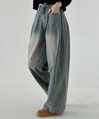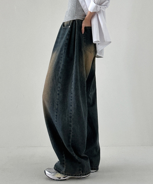 사이드 핀턱 블러 워싱 와이드 데님 팬츠_YellowBlack