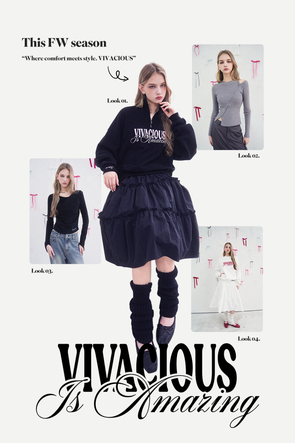 비바셔스(VIVACIOUS)는 독보적인 비주얼과 설렘으로 매일을 장식하며, 사랑받고 사랑하며 사랑을 나누는 여성들을 위한 브랜드입니다. 데일리 룩에 영감을 줄 비바셔스를 참고해 보세요.