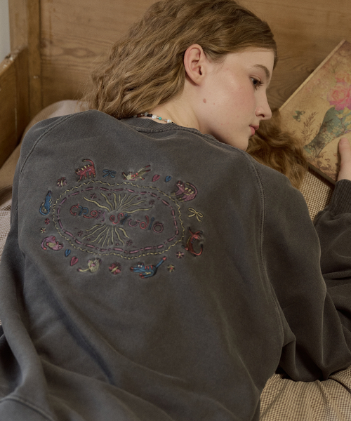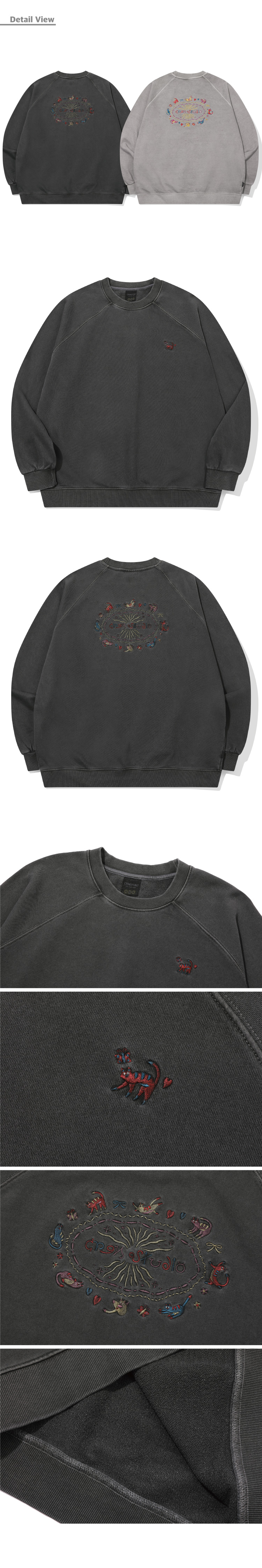 캣 스티치 레글런 피그먼트 맨투맨 스모크블랙