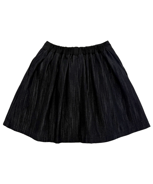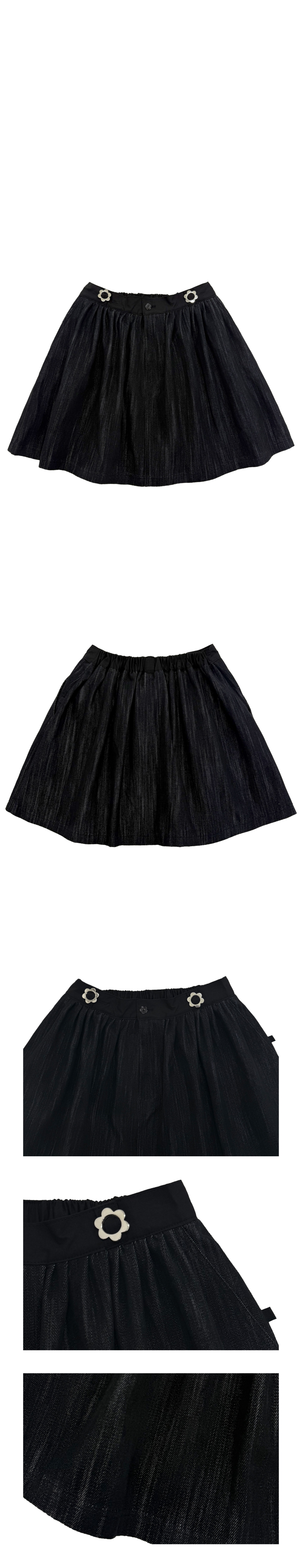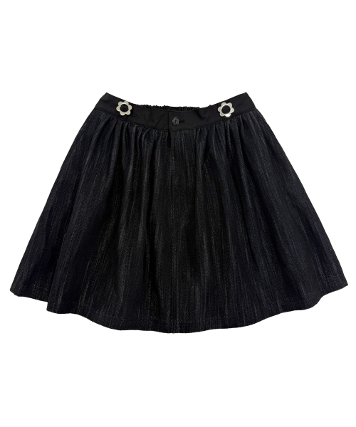뒷밴딩 데님 미니 스커트. 꽃장식 벨트고리와 꽃단추를 가미.