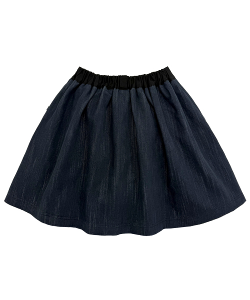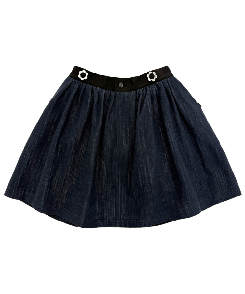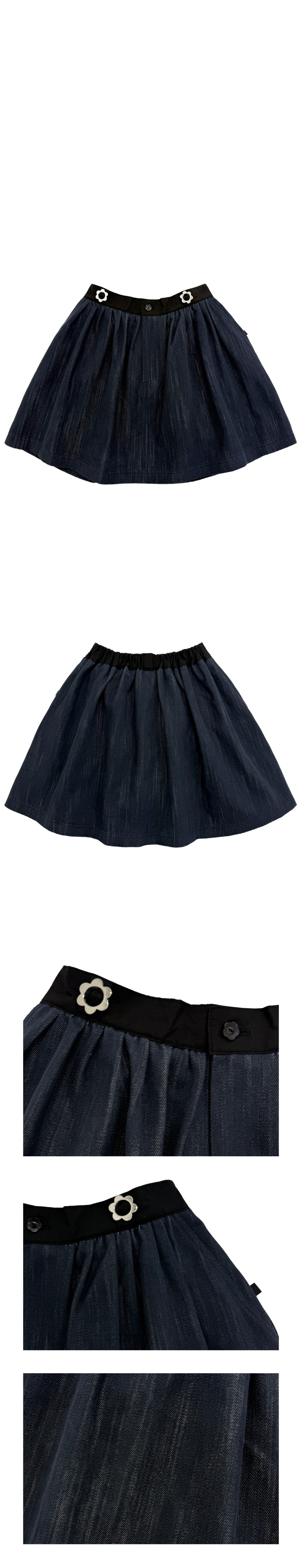 뒷밴딩 데님 미니 스커트. 꽃장식 벨트고리와 꽃단추를 가미.