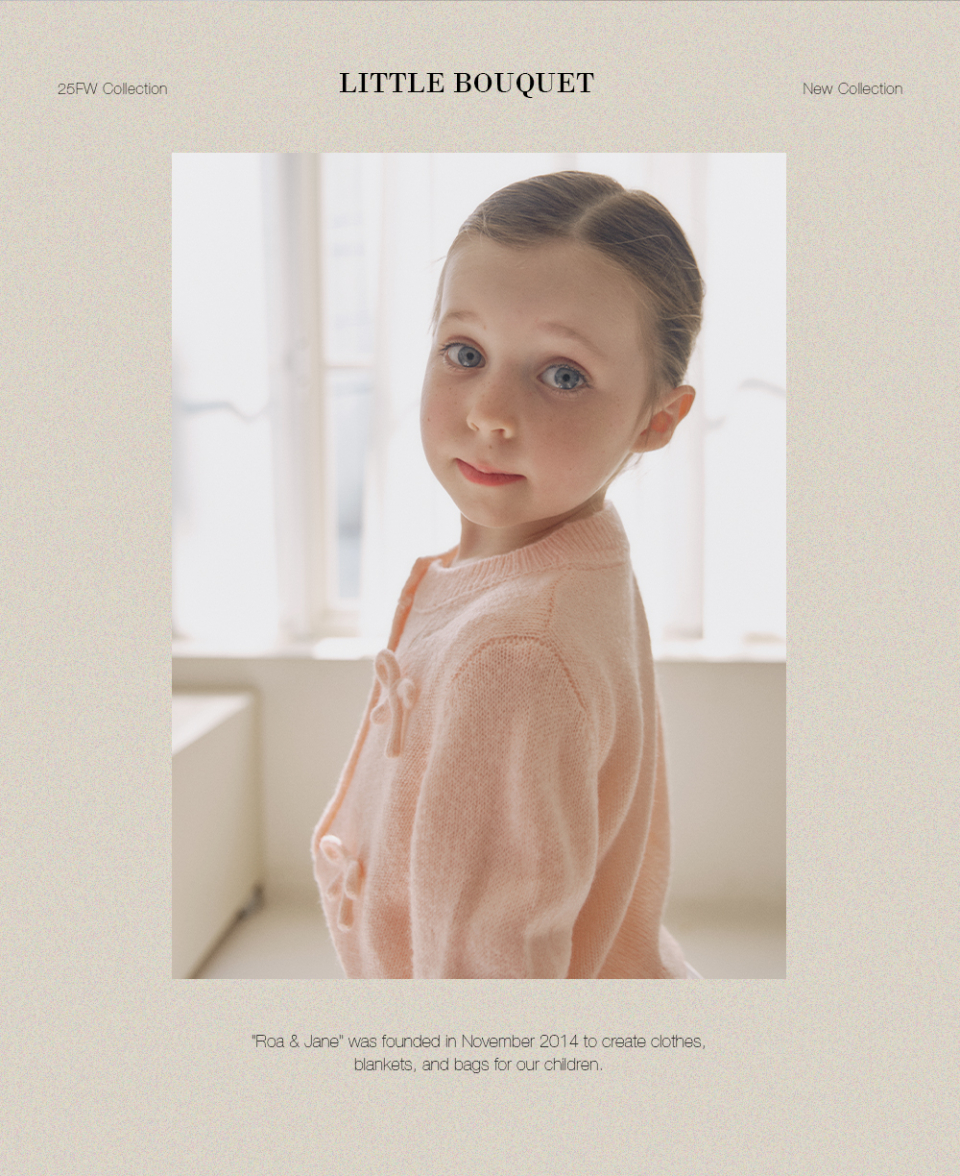 로아앤제인(ROANJANE)은 가장 주목받고 있는 키즈 디자이너 브랜드입니다. 창업자의 두 딸의 이름을 합쳐 이름 지은 로아앤제인은, '내 아이에게 입히는 옷'이라는 마음으로 제품을 만듭니다. 모던한 감성과 질 좋은 소재로 입소문을 타고 전국 25개 백화점에 직영 매장을 운영하고 있습니다.