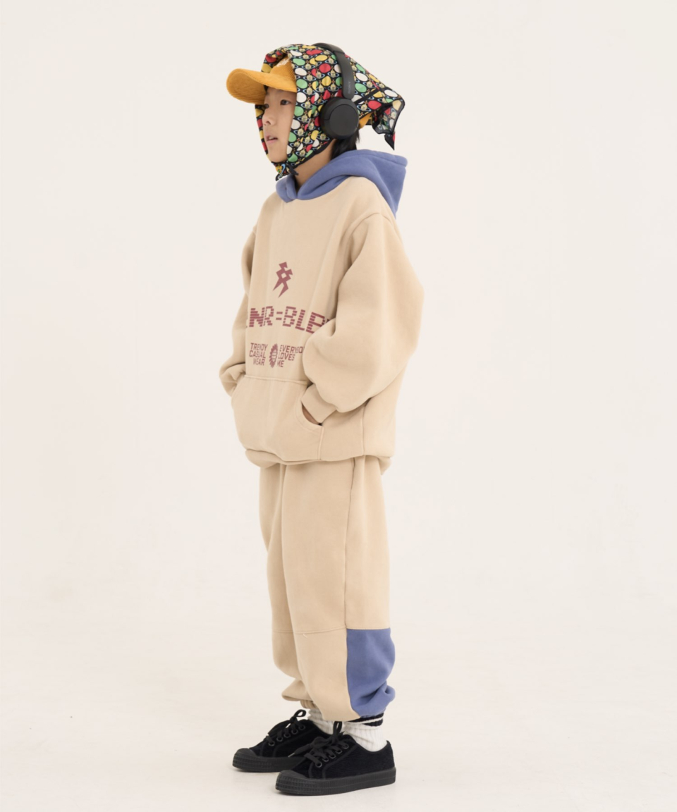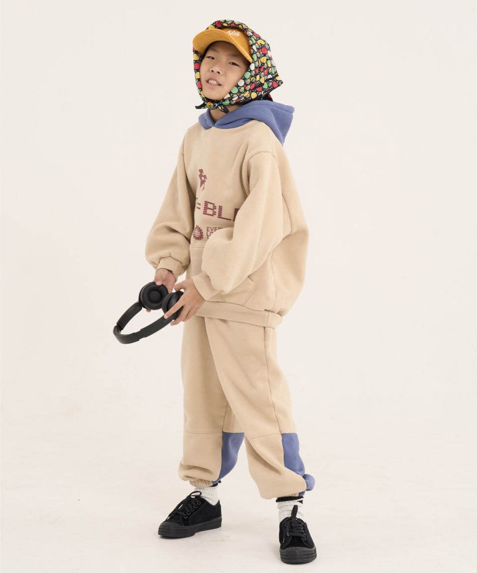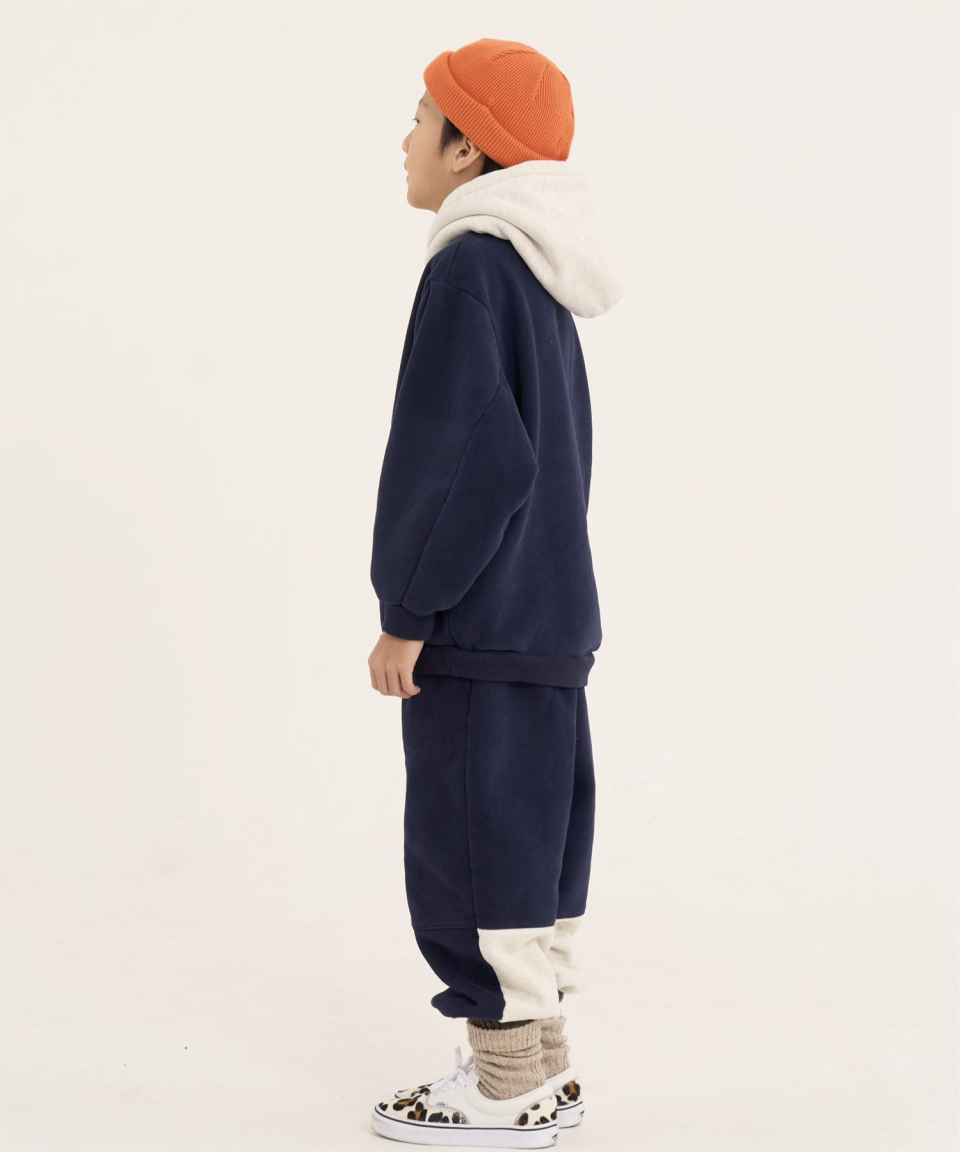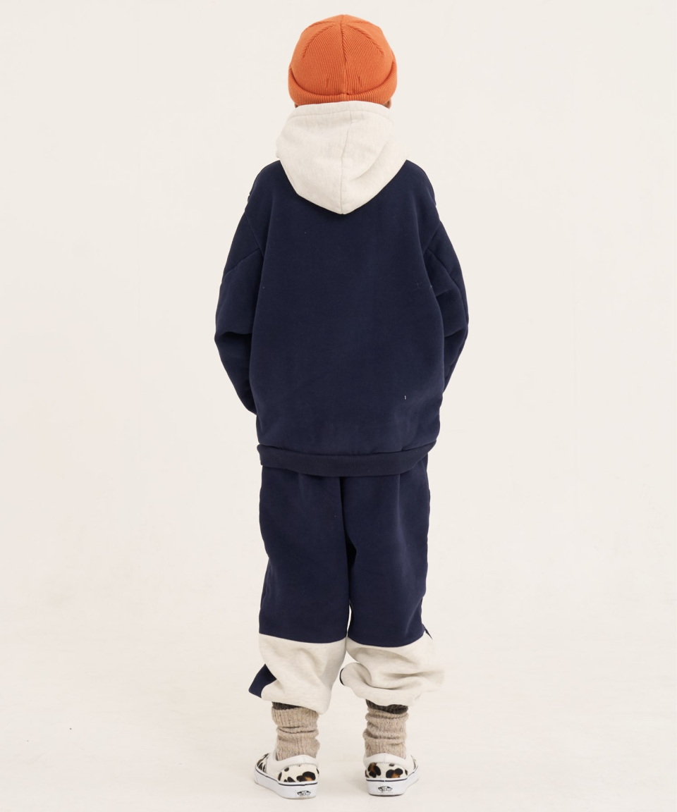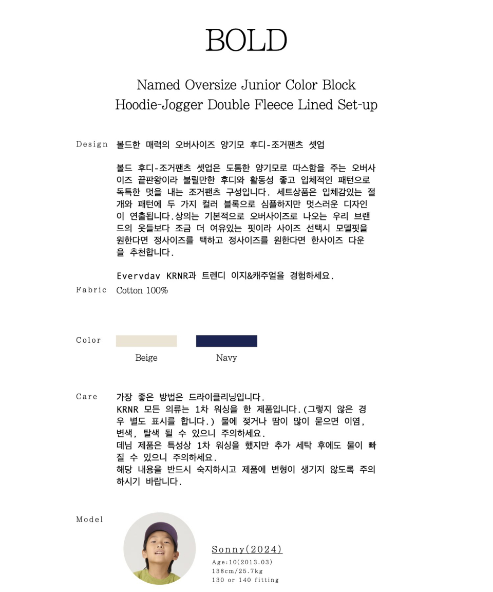 볼드 네임드 오버사이즈 주니어 컬러블록 후드-조거 양기모 셋업 네이비,베이지