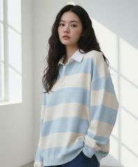 스트라이프 럭비 카라 맨투맨 [아이보리 블루]