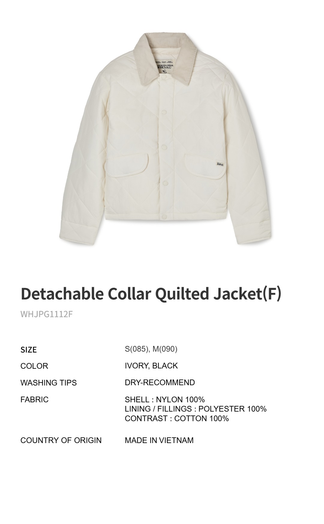 Detachable Collar Quilted Jacket(F) / WHJPG1112F