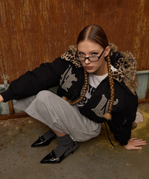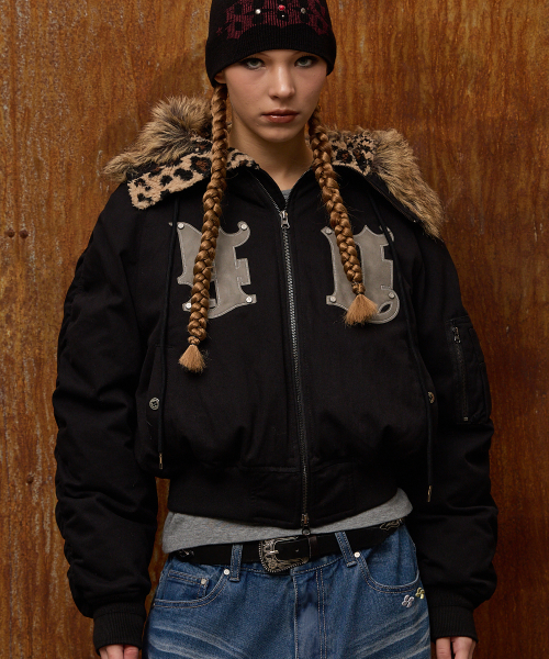 HD 아티피셜 레더 패치 봄버 다운 자켓 블랙