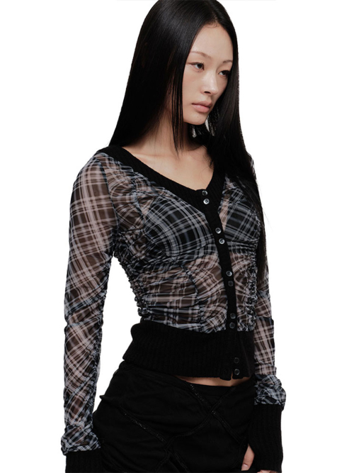 자체개발한 체크 패턴 매쉬 프린트 가디건