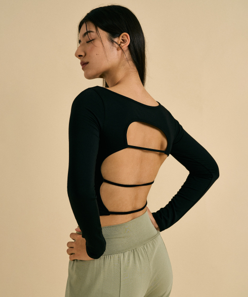 이번 시즌의 야심작이에요. 전면의 베이직한 면모에 센스 있는 반전을 더해준 백 스트랩 탑입니다.