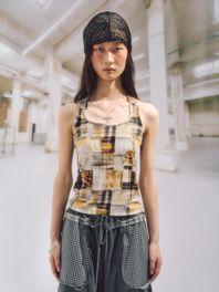 - 보트넥 긴팔 티셔츠와 홀터넥 슬리브리스가 결합 된 디자인