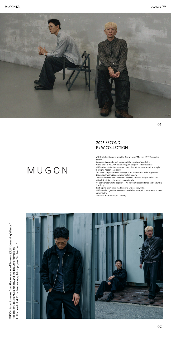 무건(MUGON)은 한국적인 감성으로 아메카지를 재해석하고, ‘덜어냄’을 중심 가치로 지속 가능성과 미니멀리즘을 지향하는 캐주얼웨어 브랜드입니다.