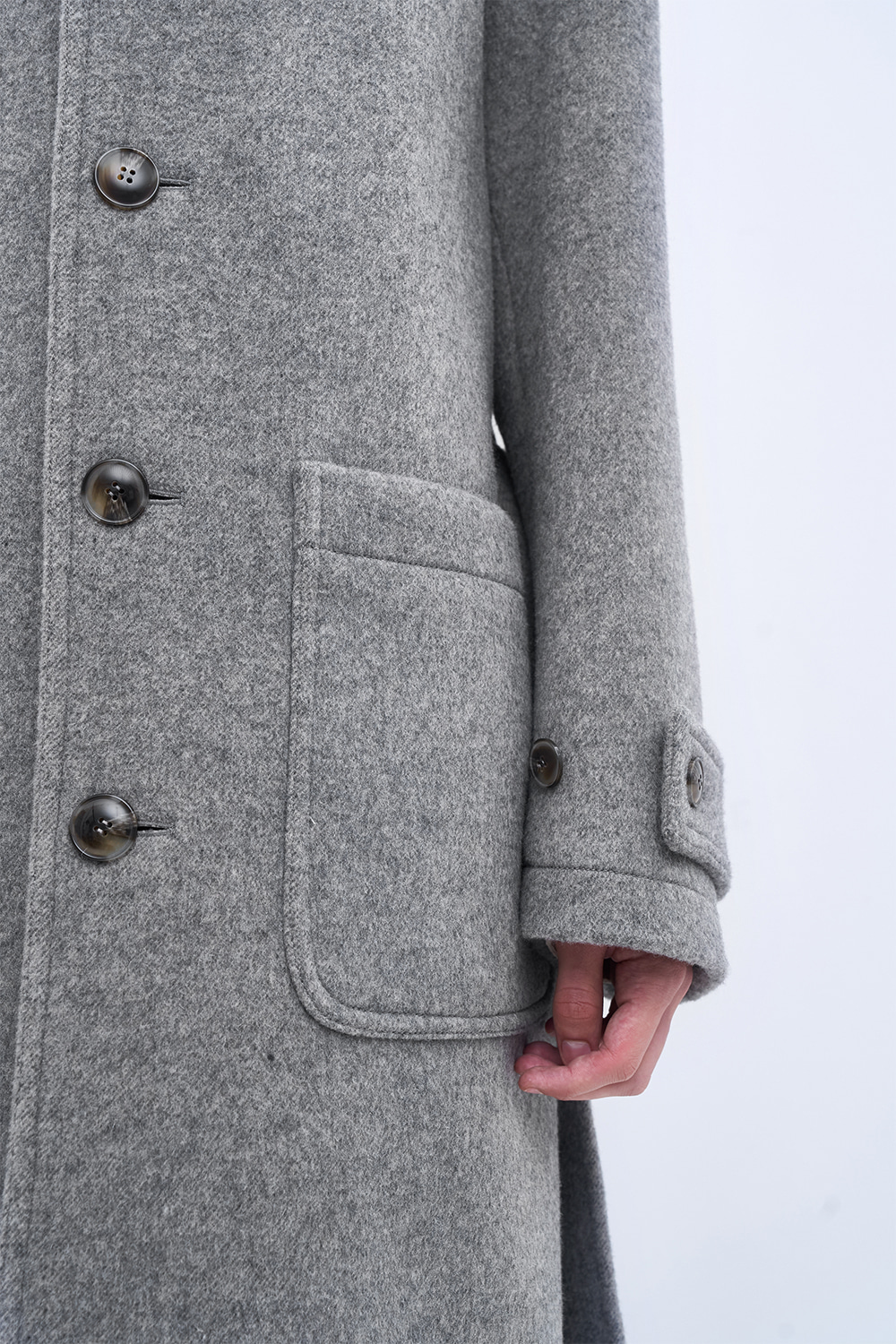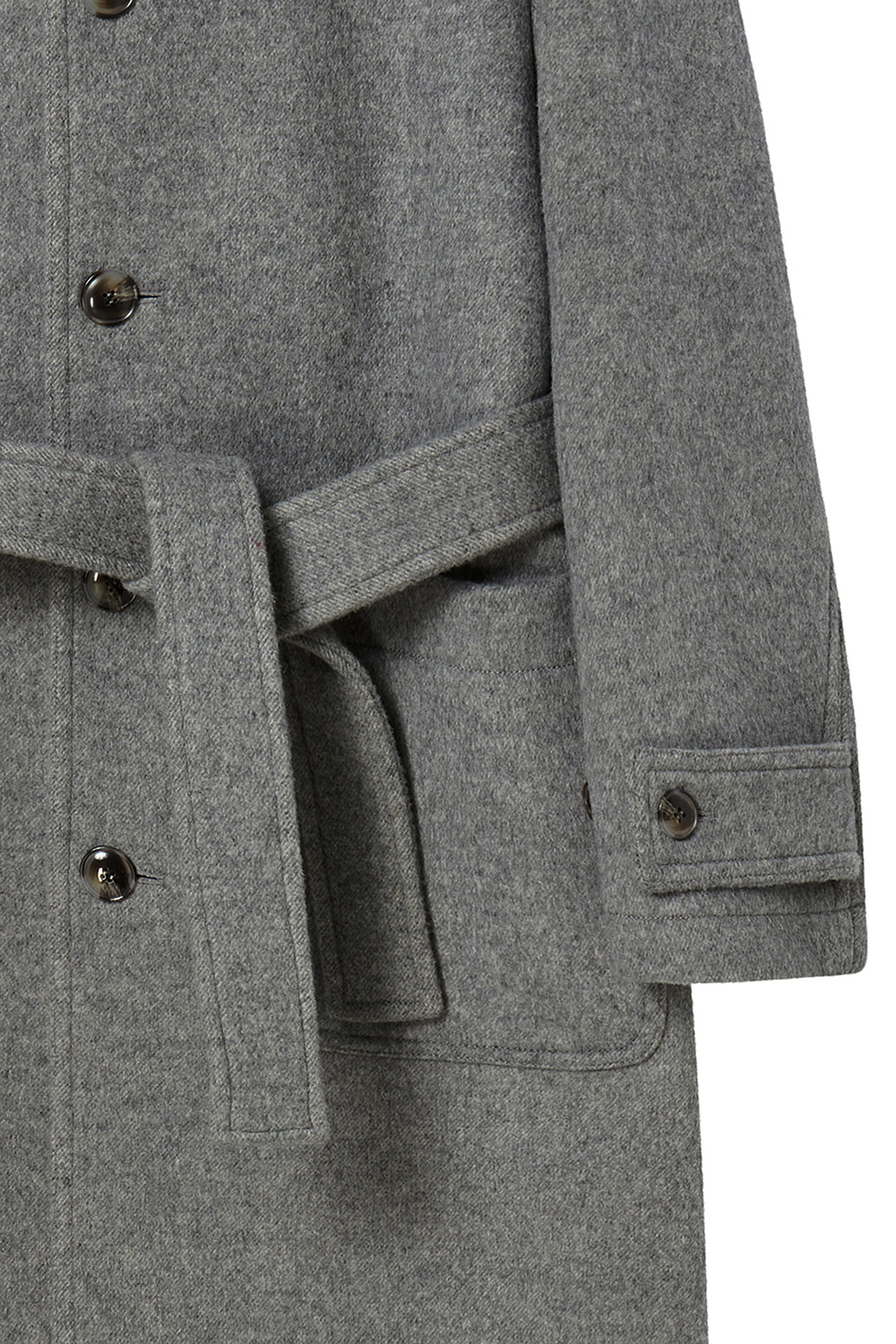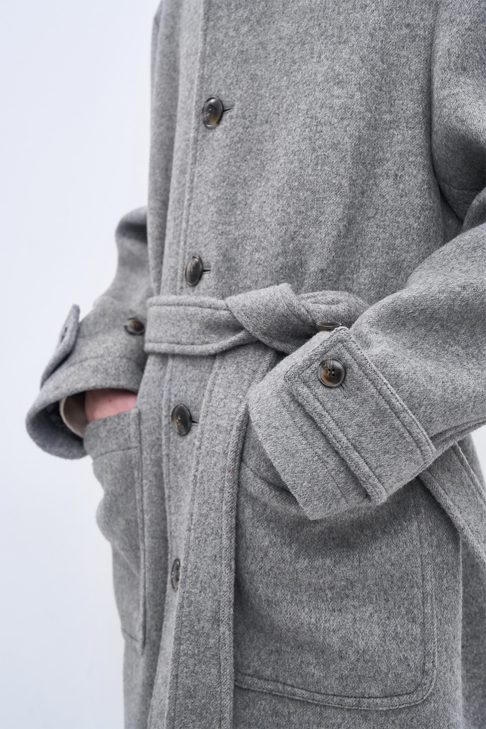 새롭게 선보이는 울 소재의 싱글 코트. 멜란지 버진 울 원사로 완성한 오묘한 컬러감과 풍부한 텍스처. 26oz의 두께감과 탄탄한 고시감이 만들어내는 구조적인 실루엣. 넓은 간격의 더블 스티치와 소뿔 단추로 구성된 절제된 디테일. 벨트 디테일을 더해 바람과 추위에 대응하는 스타일리시한 겨울 아우터.