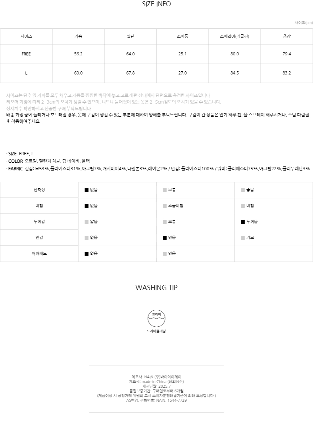 캐시미어 울 혼방의 도톰하고 따듯한 소재감으로 제작되었습니다.