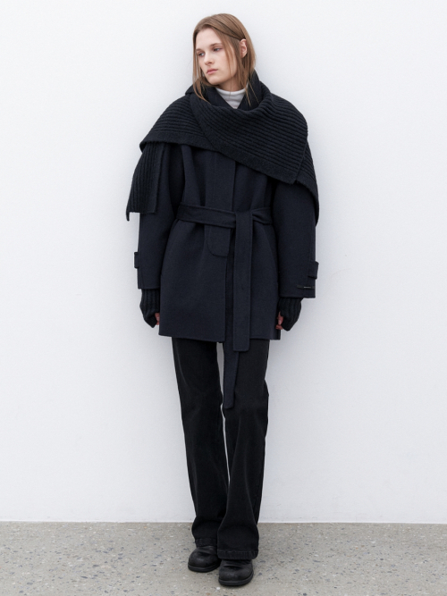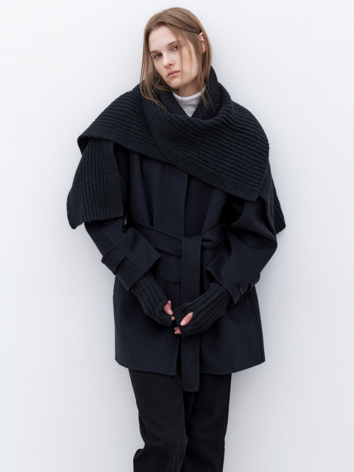 니트 머플러, 핸드 워머의 세트로 구성된 발마칸 디자인의 핸드메이드 하프 코트입니다.