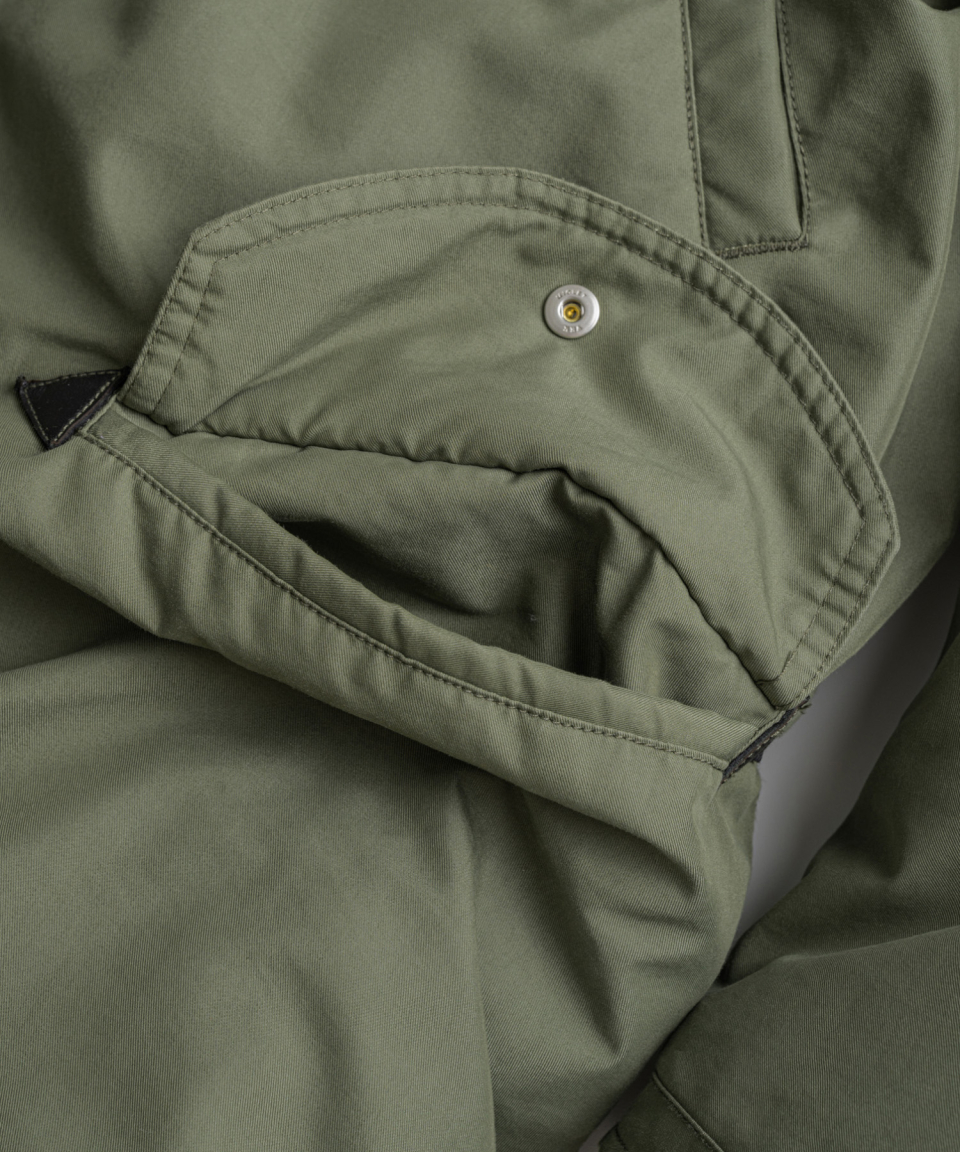겉감에는 마찰과 오염에 강한 COTTON:POLY 패브릭으로 고시감 있는 실루엣이 연출되며, 안감에는 부드러운 착용감과 내구성이 우수한 RIPSTOP NYLON 패브릭을 채택하였습니다.