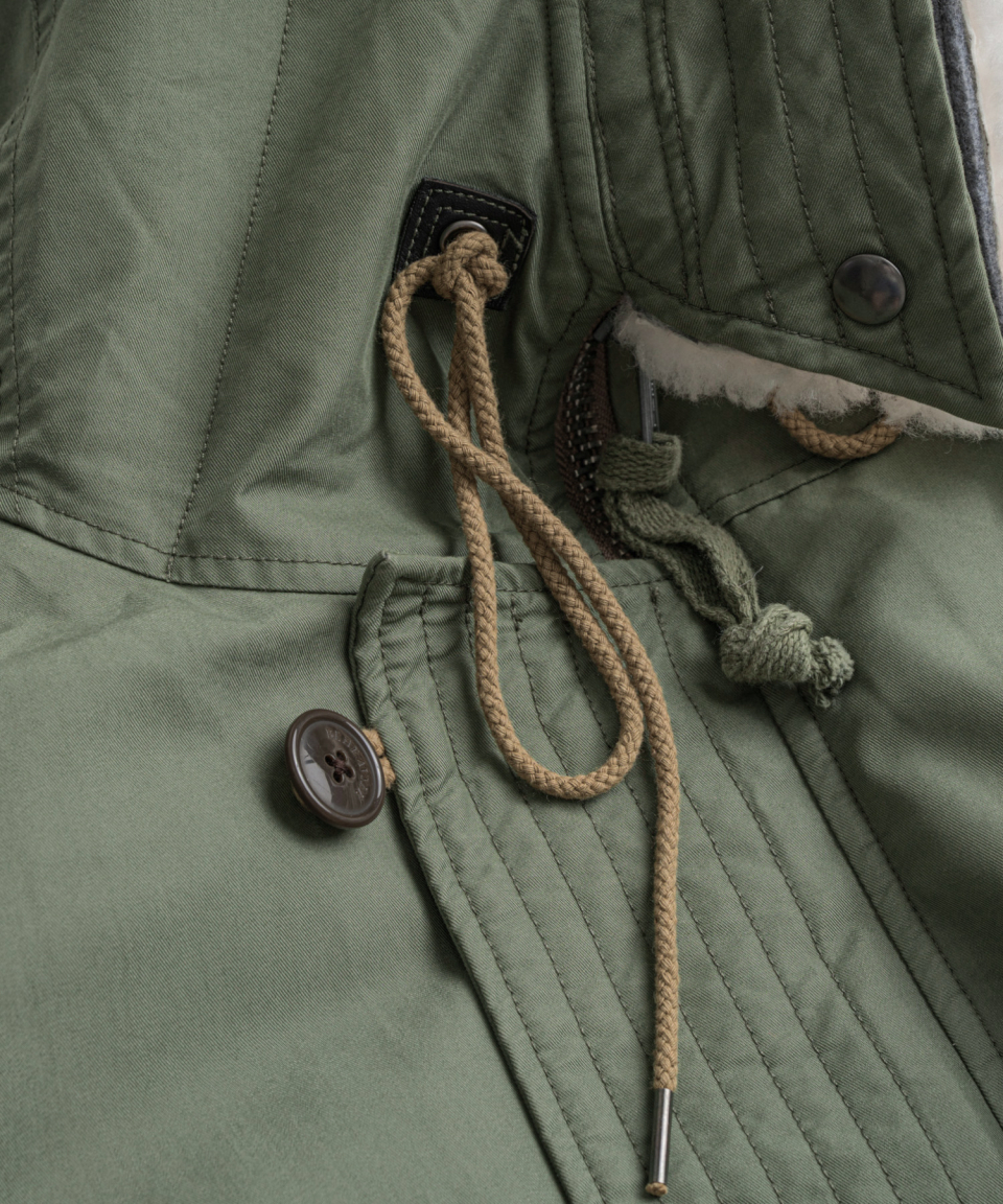 후드와 허리춤 안감에 실루엣을 조절할 수 있는 스트링이 준비되어 있으며, 사용 시 끈의 탈락을 방지하는 소가죽 덧댐으로 마무리됩니다.