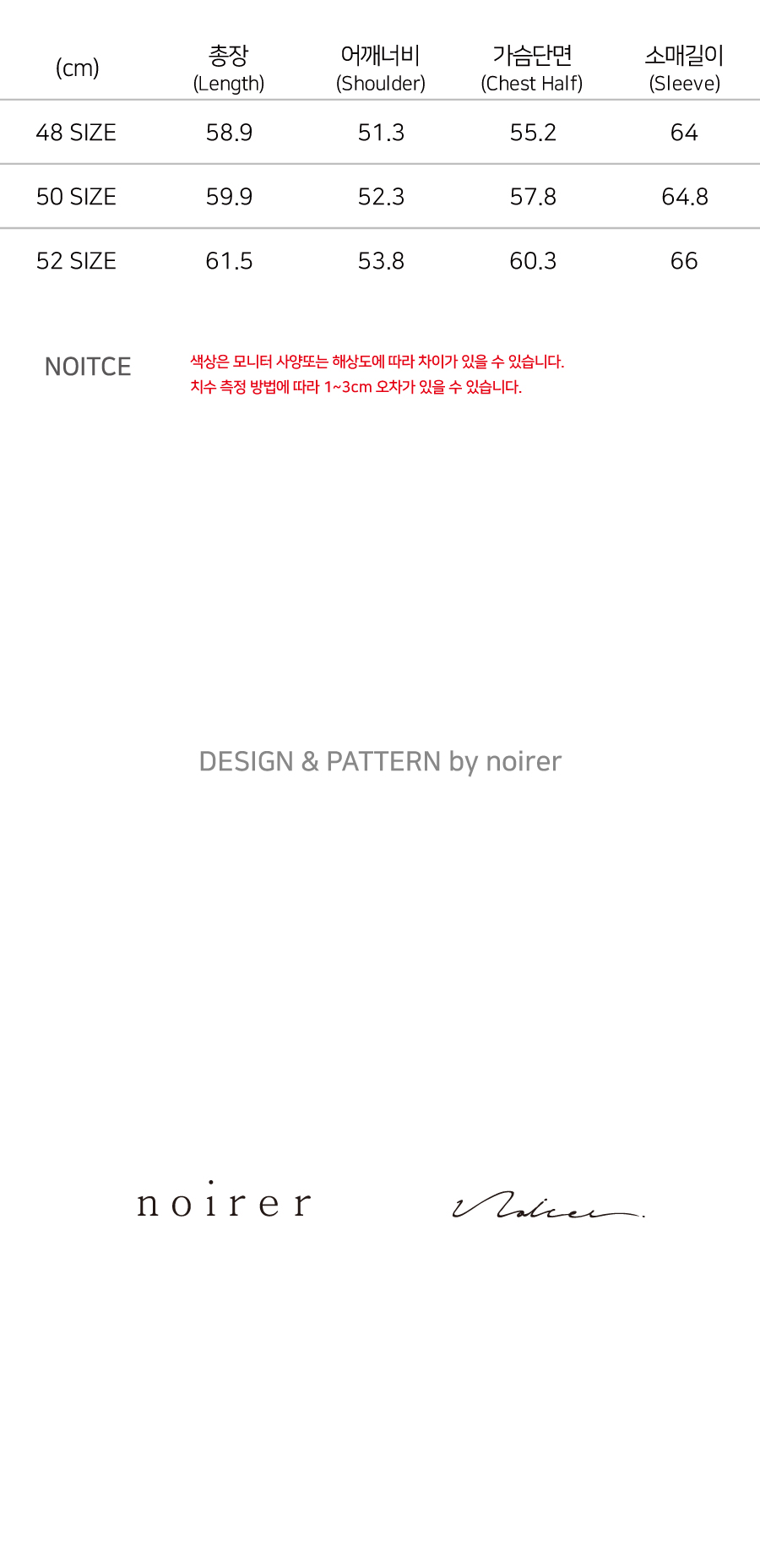 NOIRER(노이어)는 noir + er’로 불어 ‘noir’의 사전적 의미인 ‘농후한, 짙은, 어두운’이란 단어에, 만드는 사람인 ‘-er’을 붙인 합성어로 말 그대로 해석하면 ‘짙은 옷을 만드는 사람’으로 우리에게 옷이란 입는 사람의 철학과 살아온 과거가 그리고 앞으로의 삶에 대한 조용한 의지가 담겨있다.