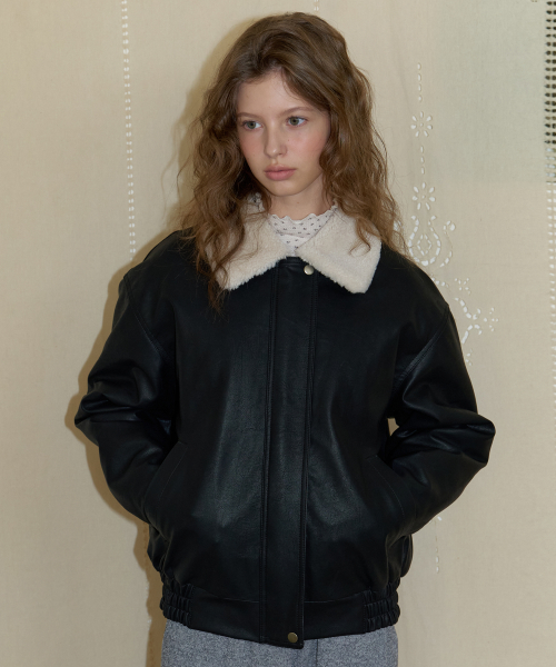 A ROUND COLLAR FAUX LEATHER JACKET_BLACK