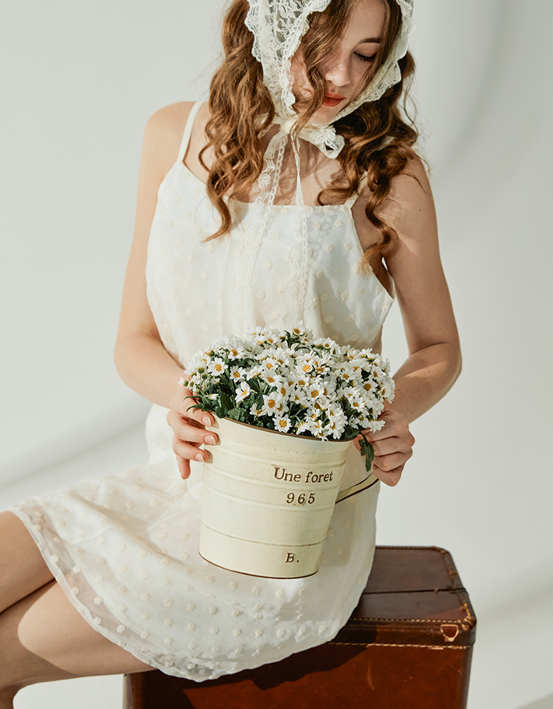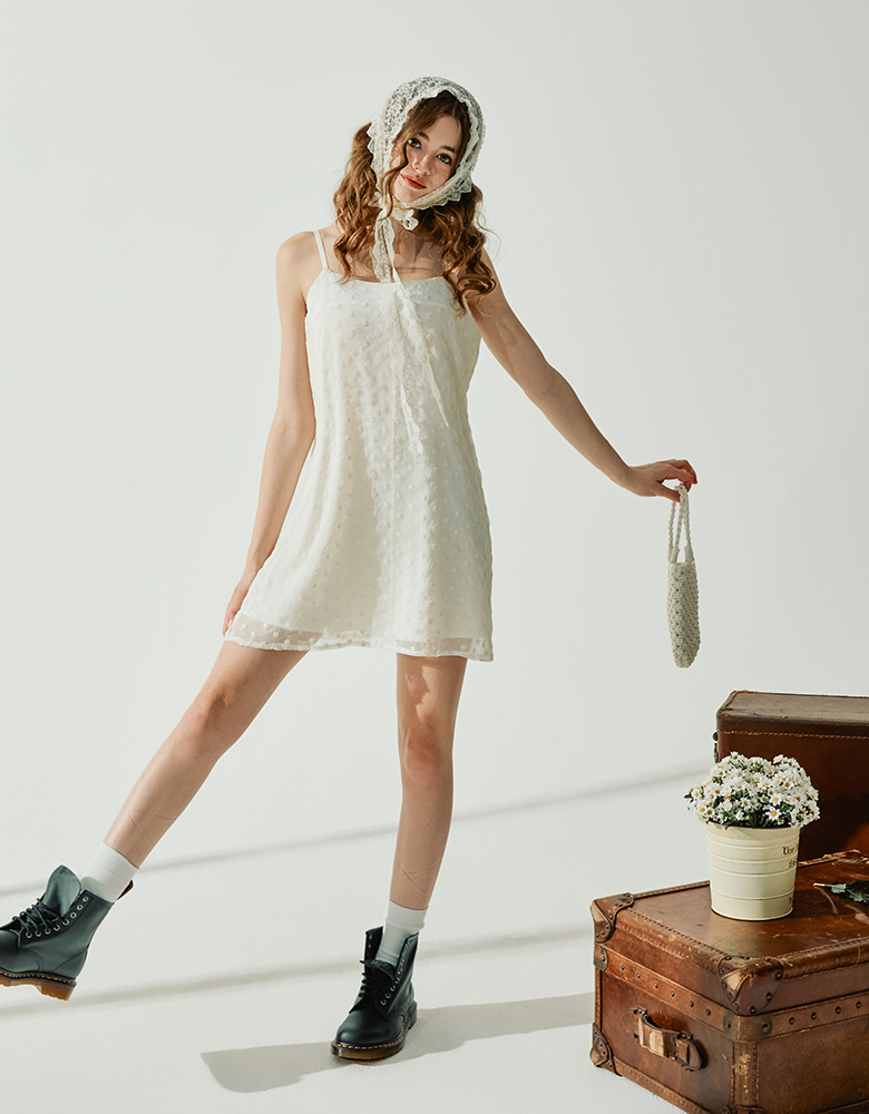 · 러블리한 플라워 엠브로이더리 쉬폰 패브릭이 매력적인 미니 원피스로 귀여운 바캉스룩 뿐 아니라