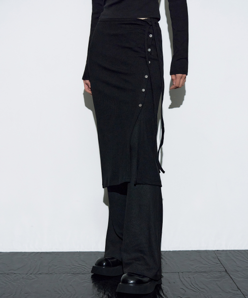 롱한 기장의 랩 스커트와 부츠컷 팬츠로 구성된 투 피스입니다.
