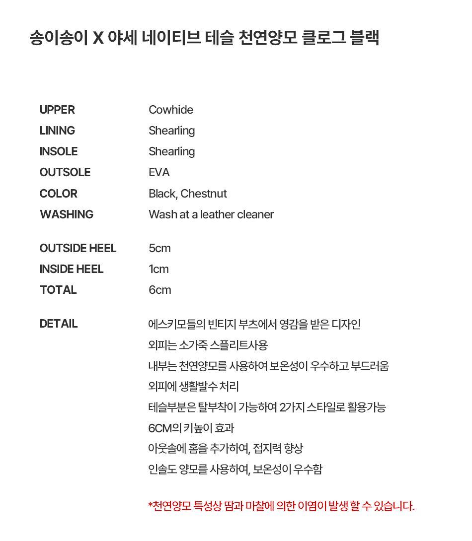 송이송이x야세 네이티브 테슬 천연양모 클로그 체스넛