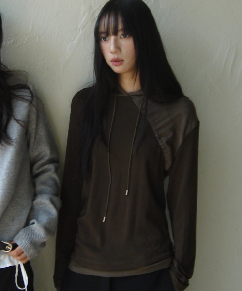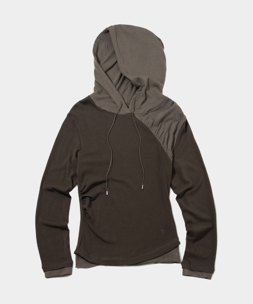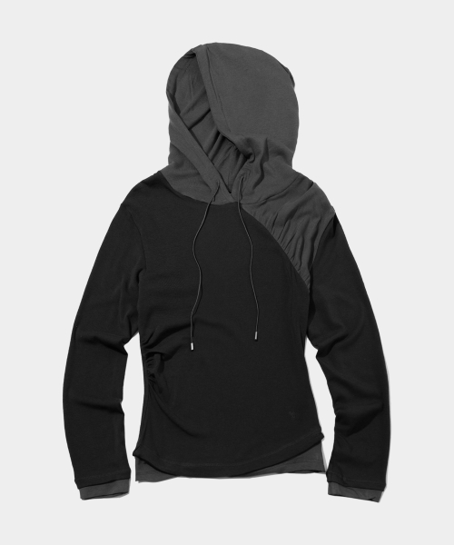 절개 사선 투톤 배색 자수 로고 후드 래글런 롱슬리브리스 티셔츠_2COLOR