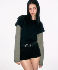 소매 레이어드 스트라이프 배색 라운드넥 티셔츠 [블랙]