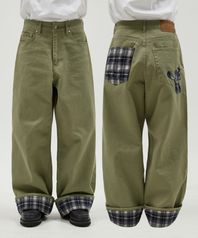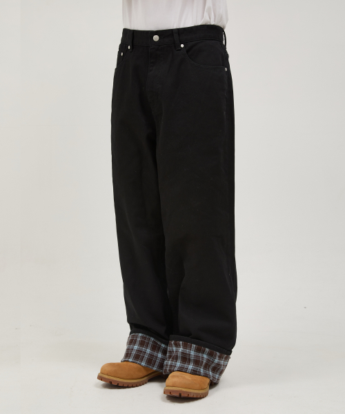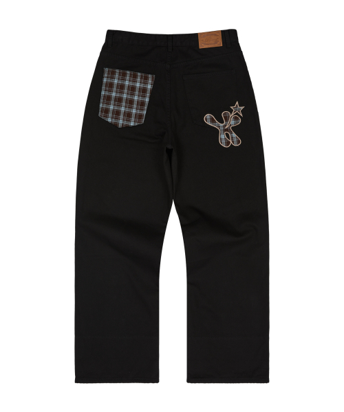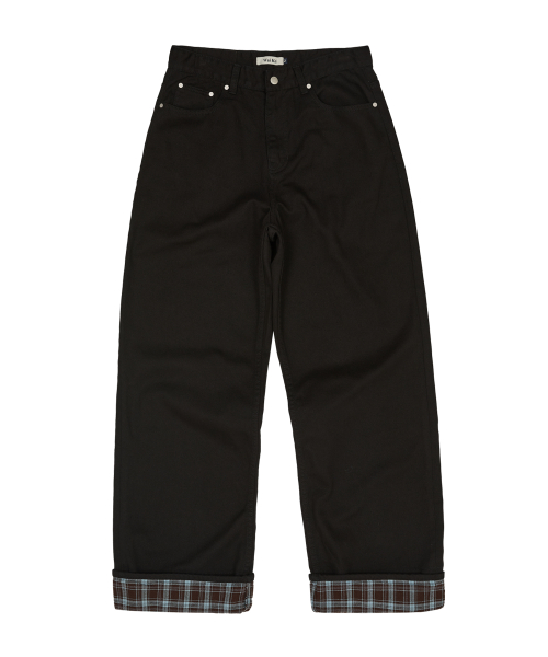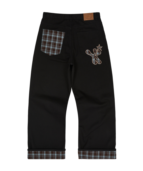 체크 아플리케 롤업 코튼 팬츠 블랙