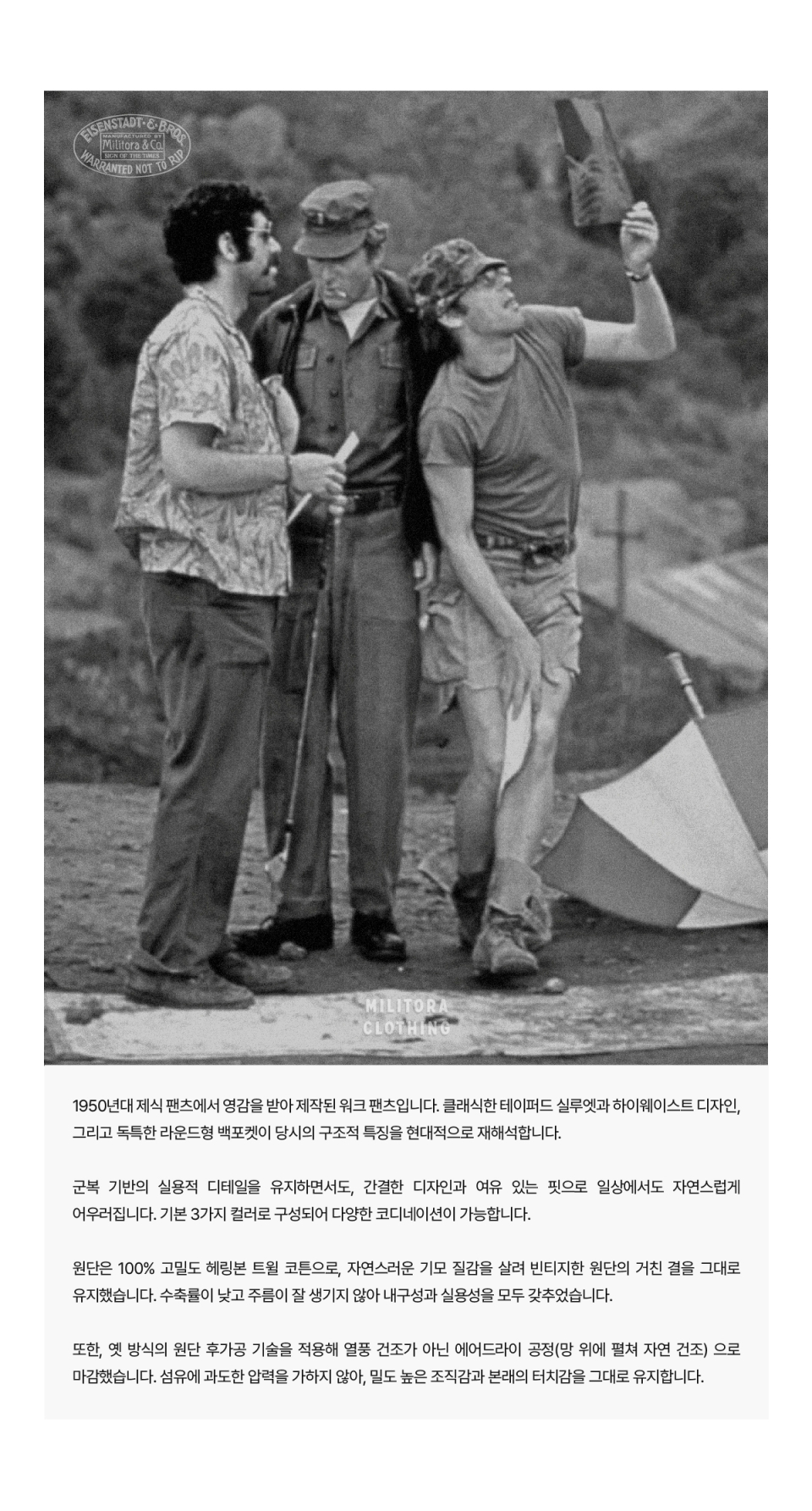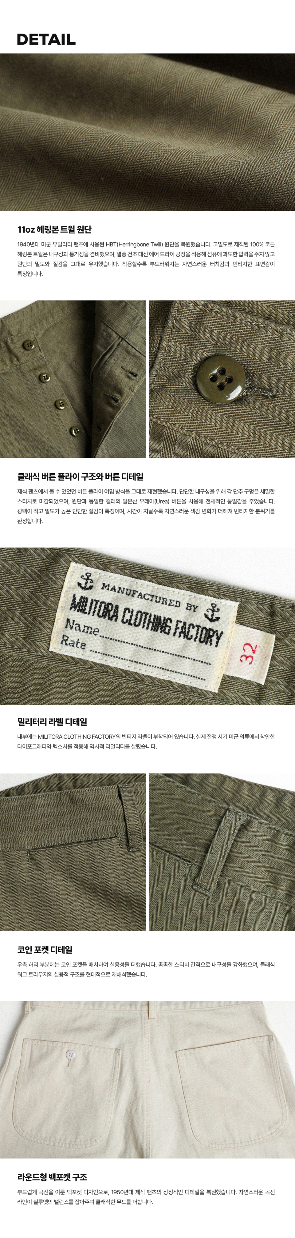 밀리토라(MILITORA)는 절제된 디테일로 강인한 매력을 표현하는 브랜드입니다. 1930년대 데님과 워크 트라우저 등 워크 웨어 기반의 의류를 현대적으로 복각합니다.