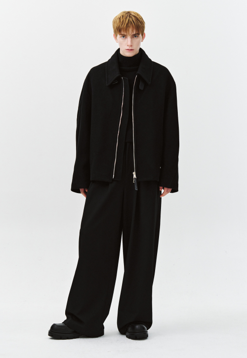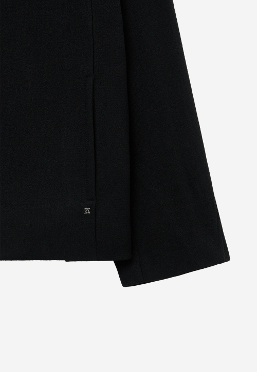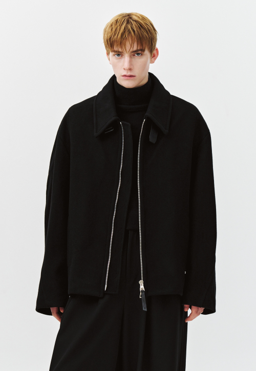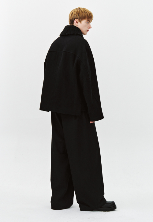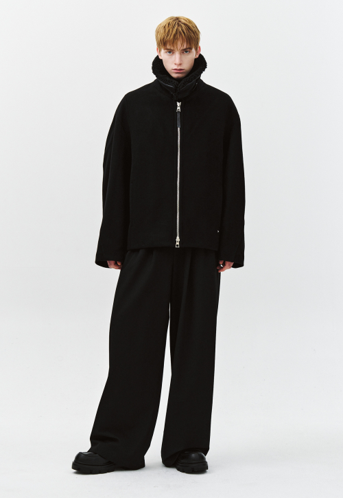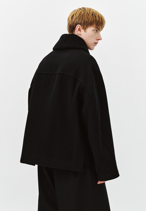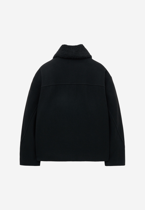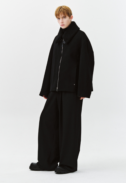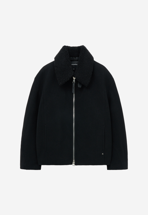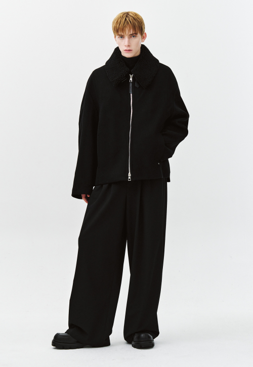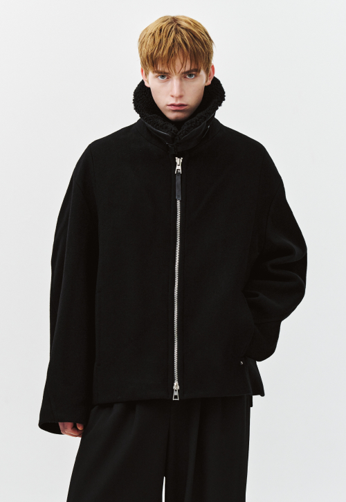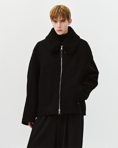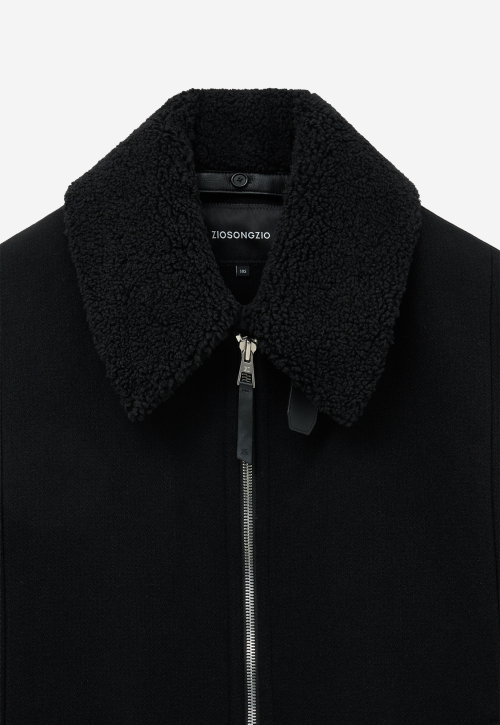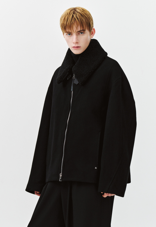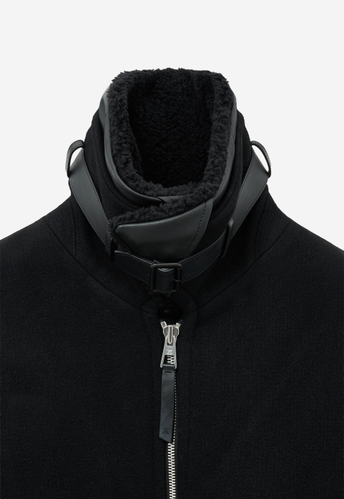 - 퍼 소재의 탈부착 가능한 칼라와 가죽 벨트 넥 여밈