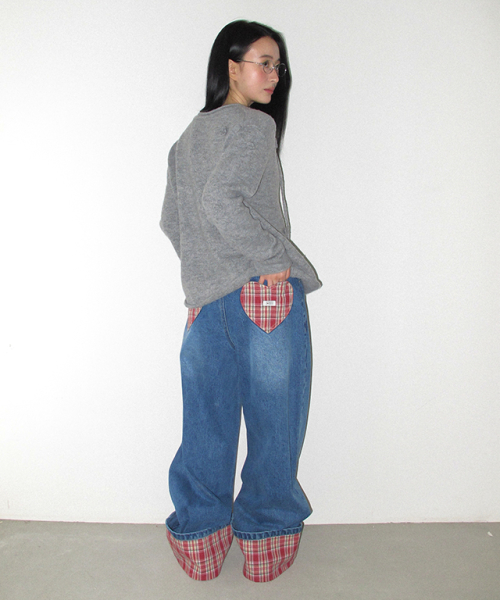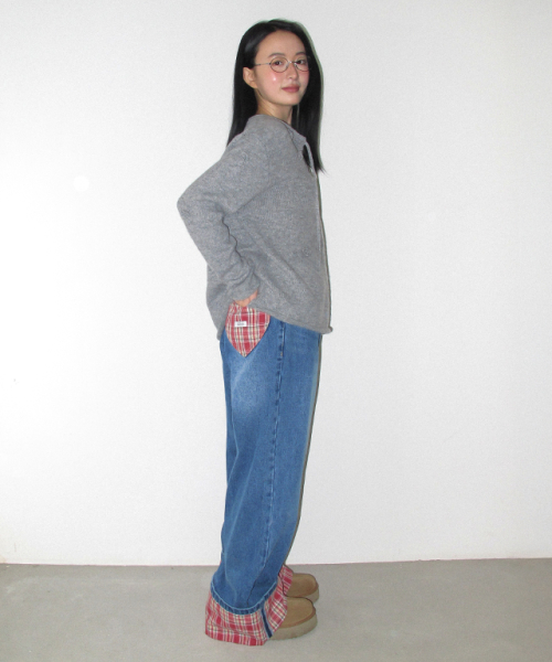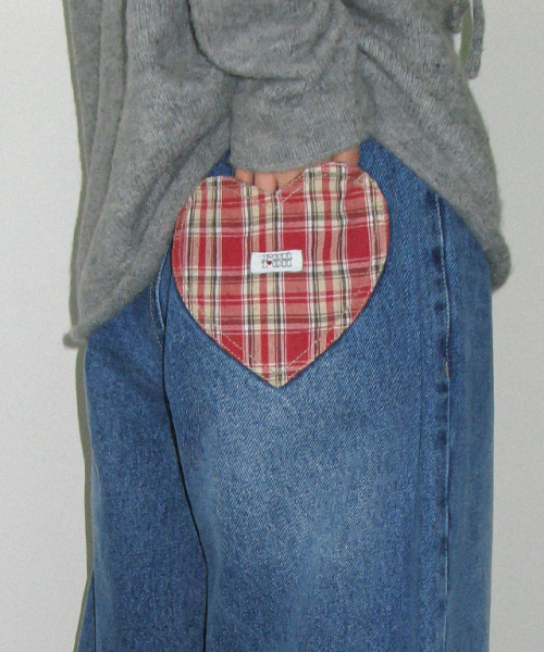 PATCH ROLL UP DENIM PANTS RED CHECK
