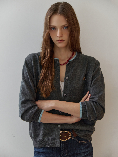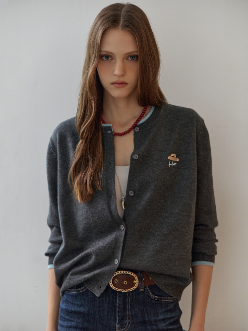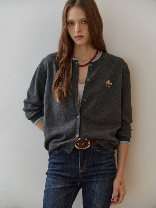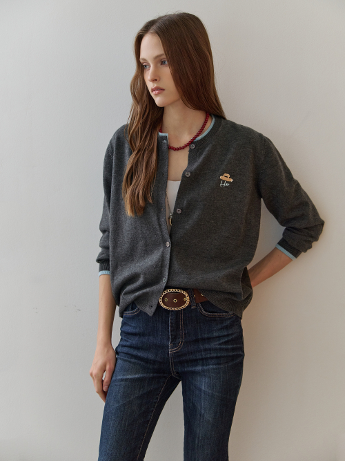 배색 라운드넥 자수 포인트 가디건