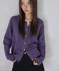 WOOL BLENDED OVAL BUTTON CREW-NECK CARDIGAN, PURPLE