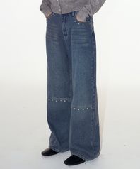 [트렌디에비뉴 PICK] 절개 라인 리벳 포인트 와이드 워시드 데님 팬츠 [중청]