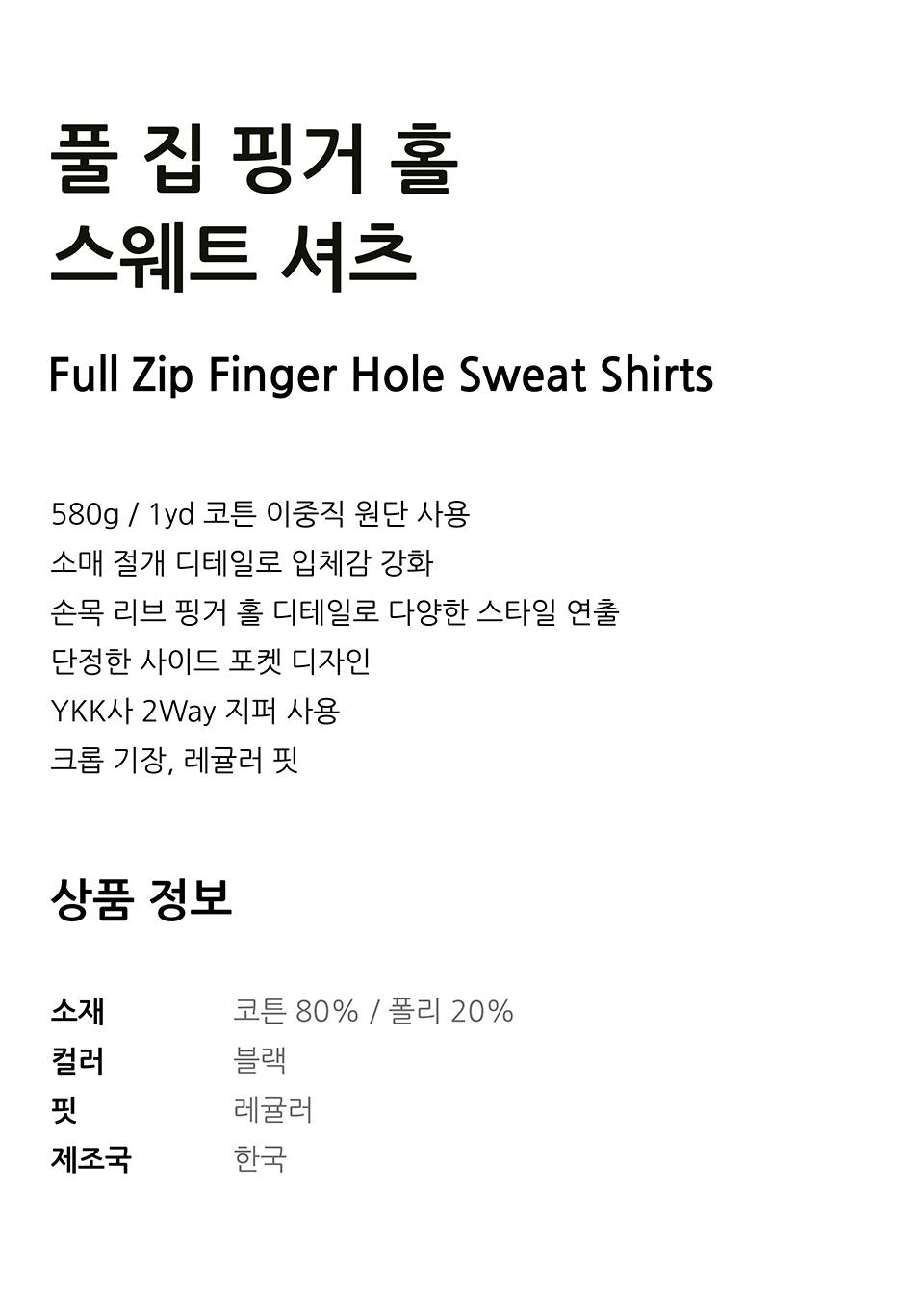 풀 집 핑거 홀 스웨트 셔츠 [블랙]