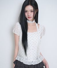 리본 타이 스퀘어넥 블라우스 화이트 도트