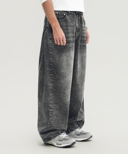 사이드 턱 커브드 와이드 데님 팬츠 (WASHED GREY)