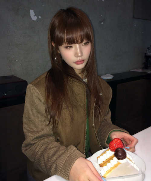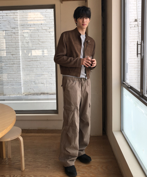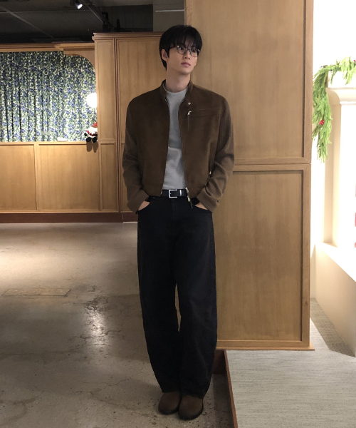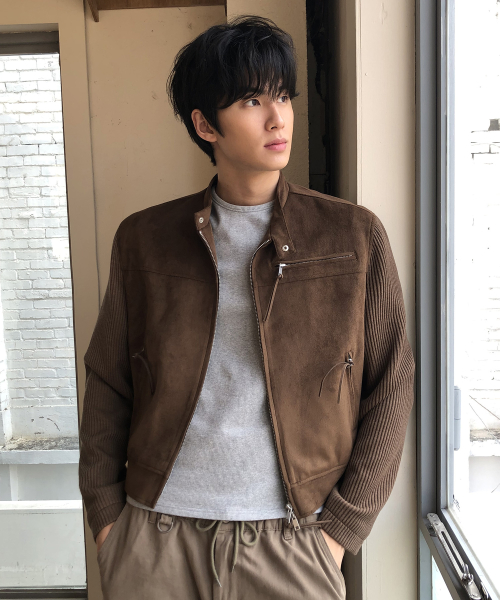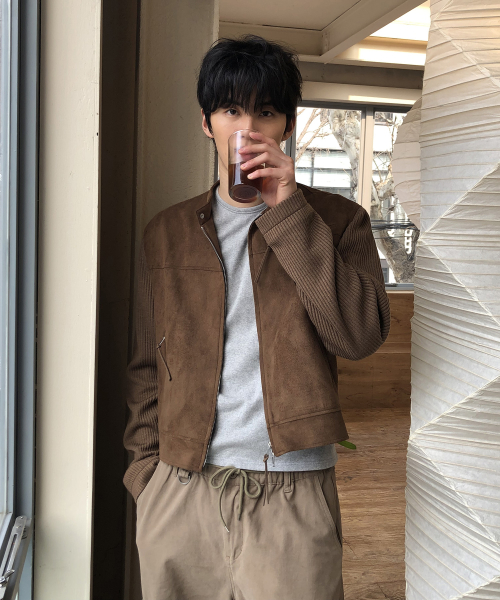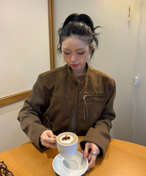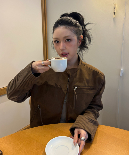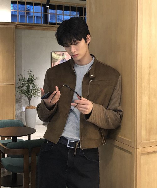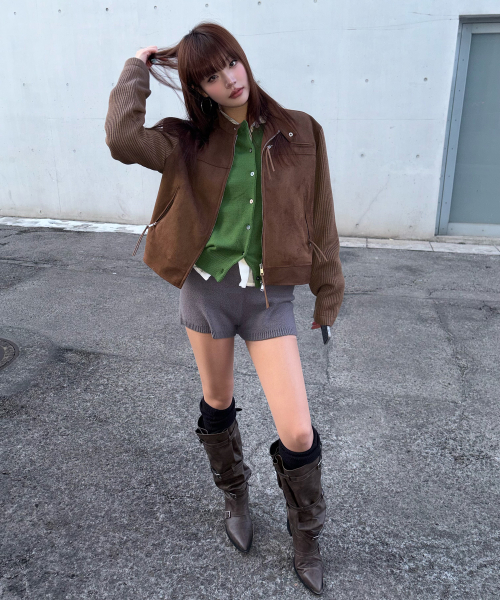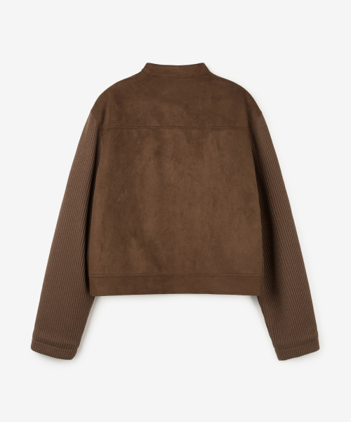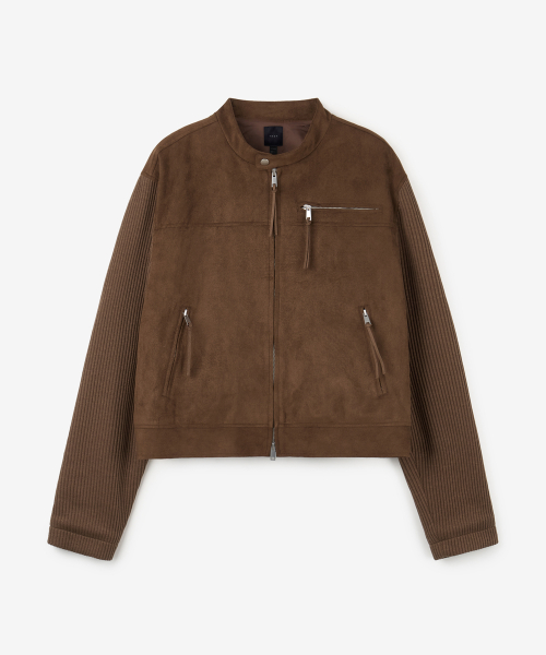 크롭 니트 스웨이드 바이커 자켓_BROWN