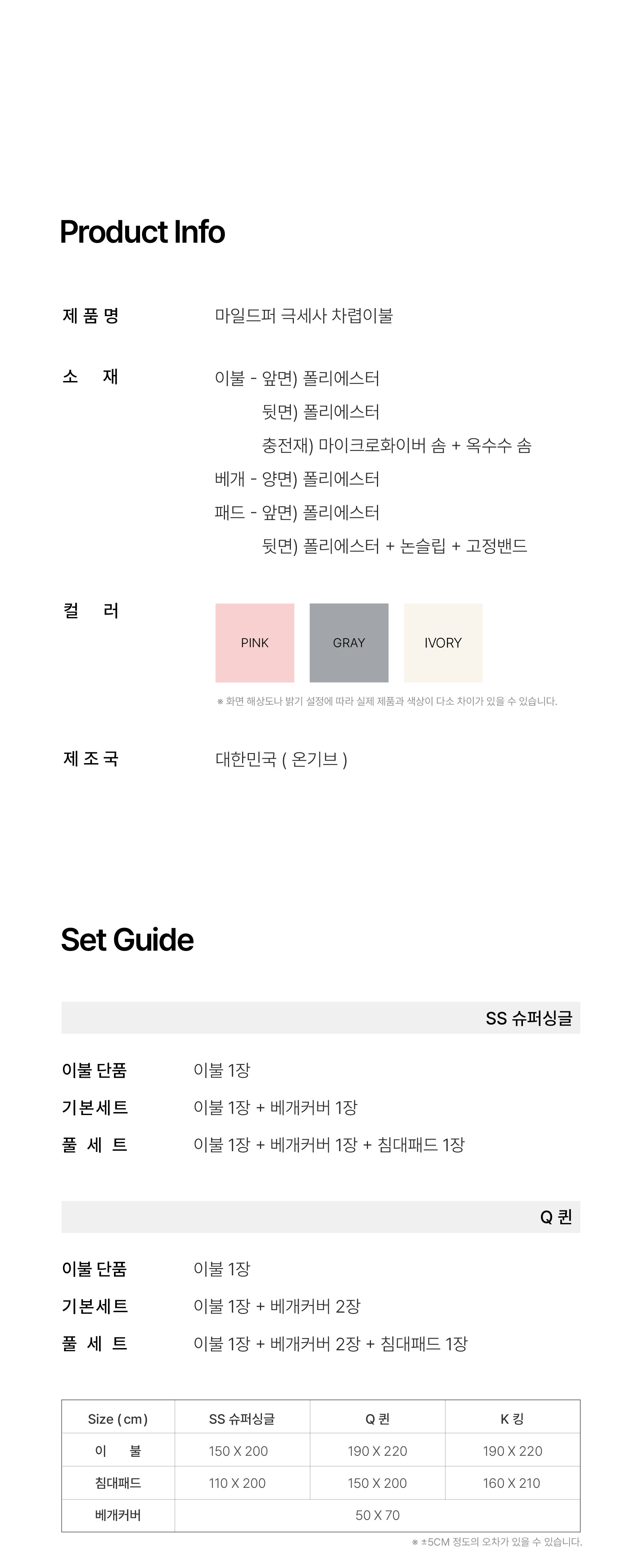 마일드퍼 극세사 차렵이불 세트 3colors(SS/Q/K)