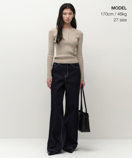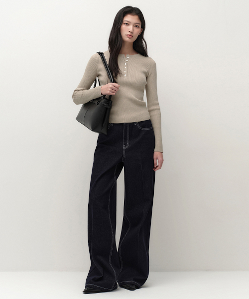 우먼즈 리브드 슬림 헨리 넥 니트 [라이트 베이지]