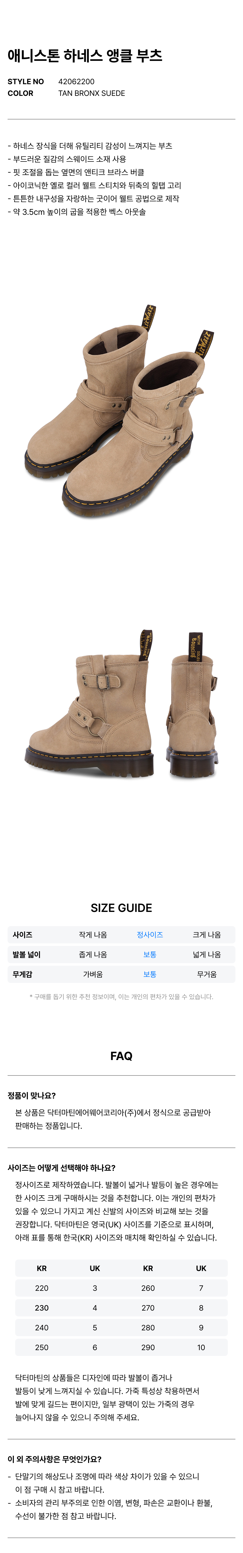 닥터마틴(DR.MARTENS)은 군인의 발을 편하게 만들기 위해 시작했지만 지금은 뮤지션, 패션피플, 모델 등의 사랑을 받는 상징적인 부츠 아이템으로 성장하며 한국뿐 아니라 전 세계에서 사랑을 받는 영국 브랜드로 자리매김을 했습니다. 편안한 착화감과 함께 다양한 스타일을 자랑하며, 신을 수록 자신의 개성과 스타일을 연출할 수 있게 돕는 독특한 매력도 함께 지니고 있습니다.